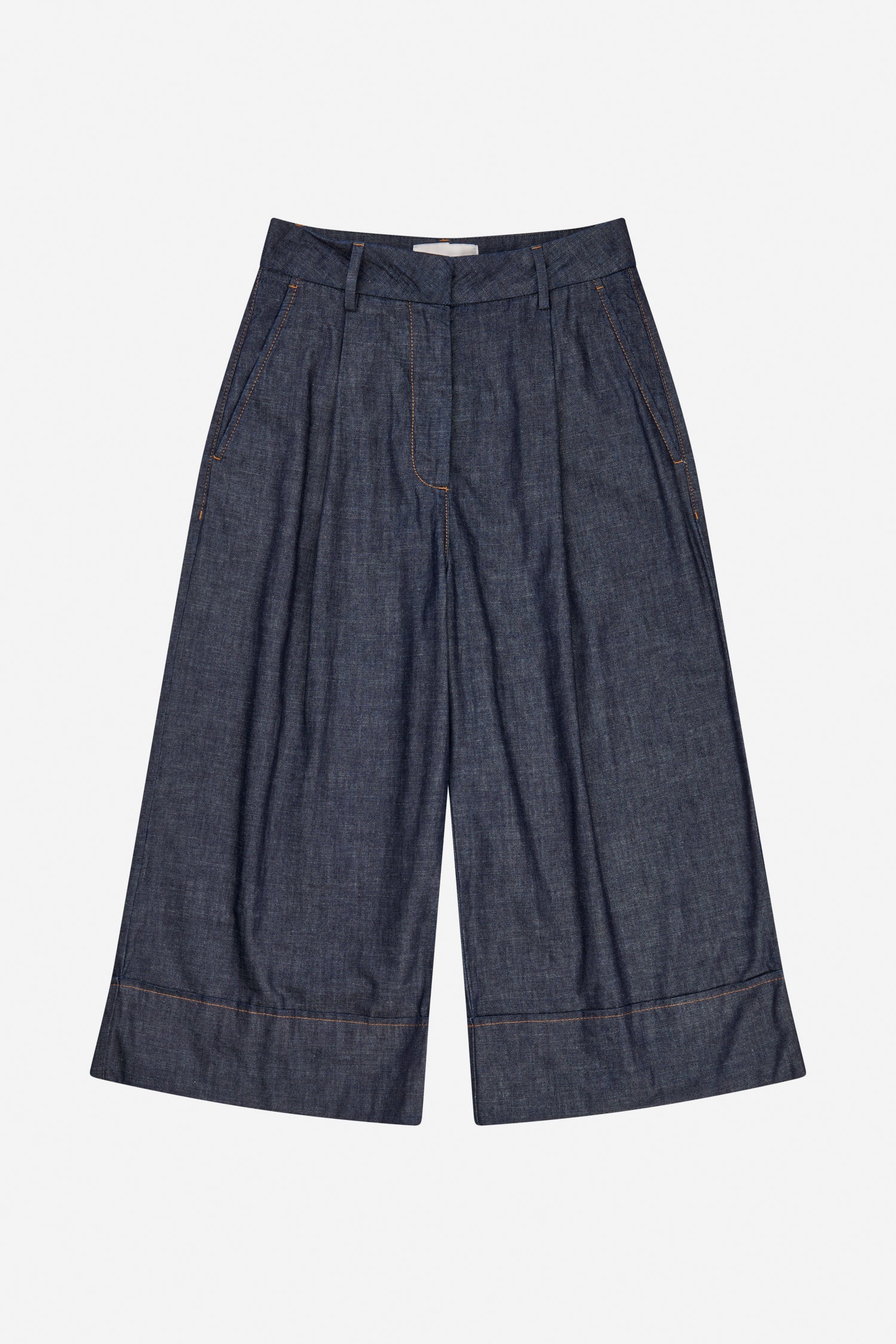 Smukke denim culotte bukser designet med elegante detaljer såsom brede ben med opsmøg, bæltestropper og sidelommer. Bukserne lukkes med lynlås foran.