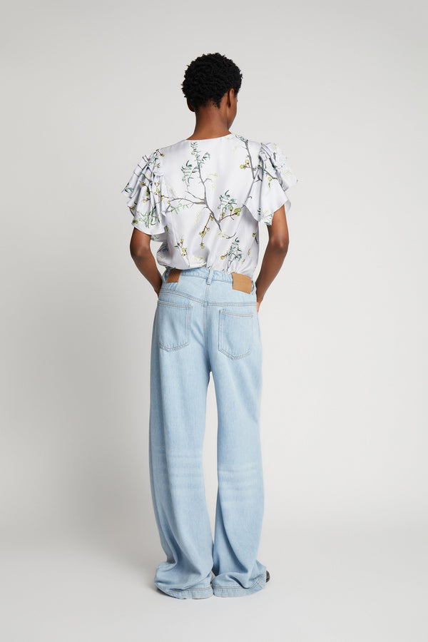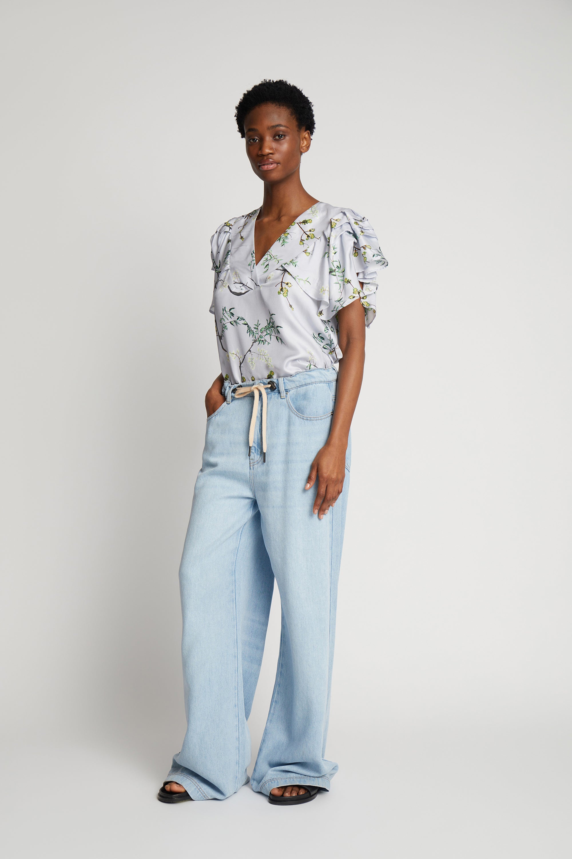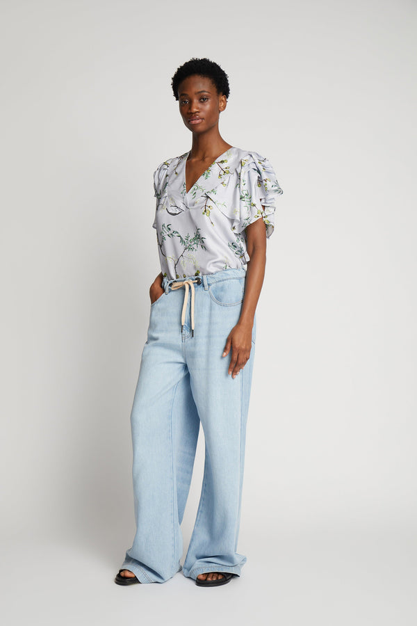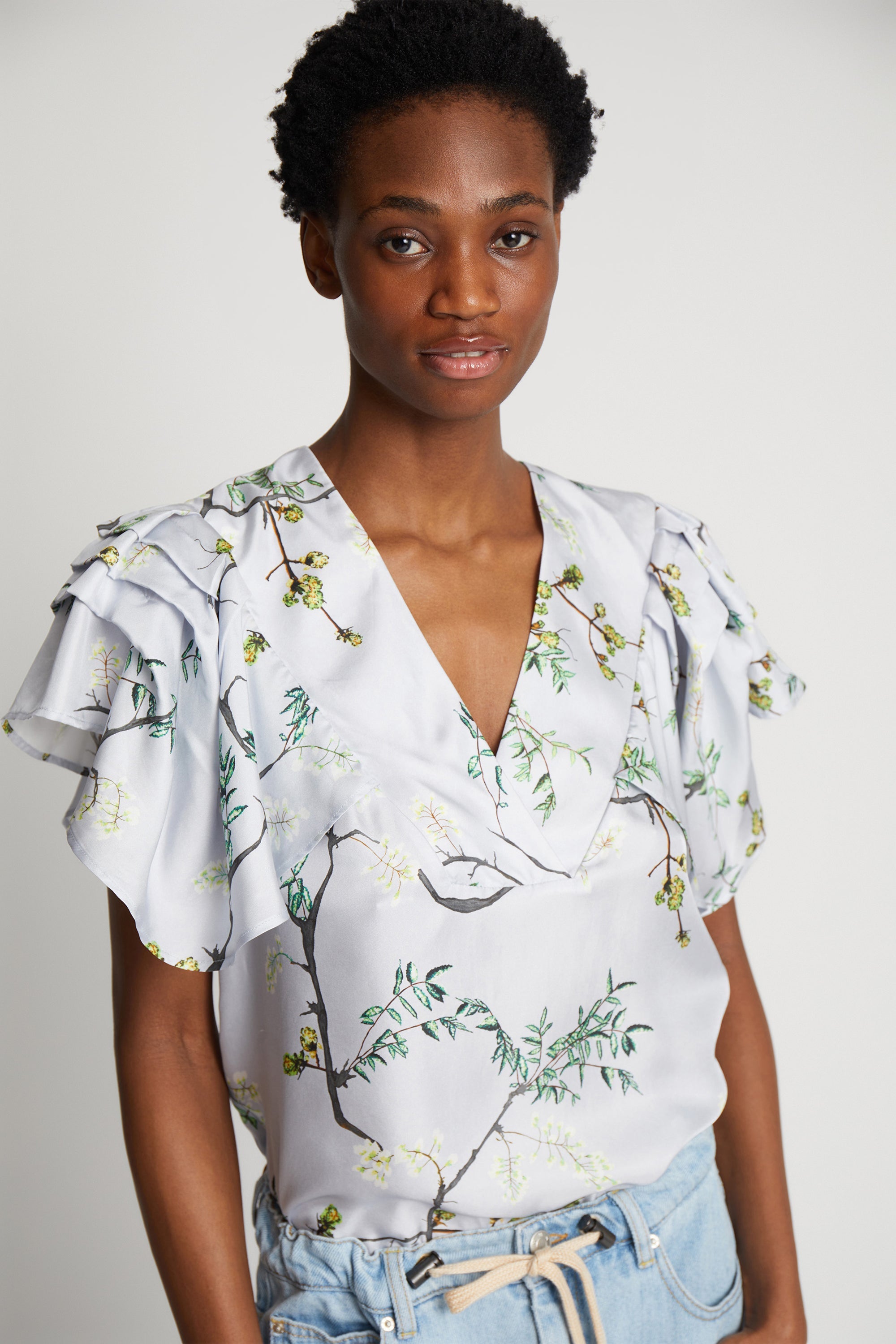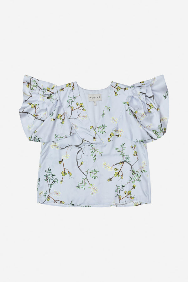 Feminin bluse med et smukt all over print designet i 100% silke. Blusen har elegante flæsedetaljer ved ærmerne og en dyb v-udskæring.