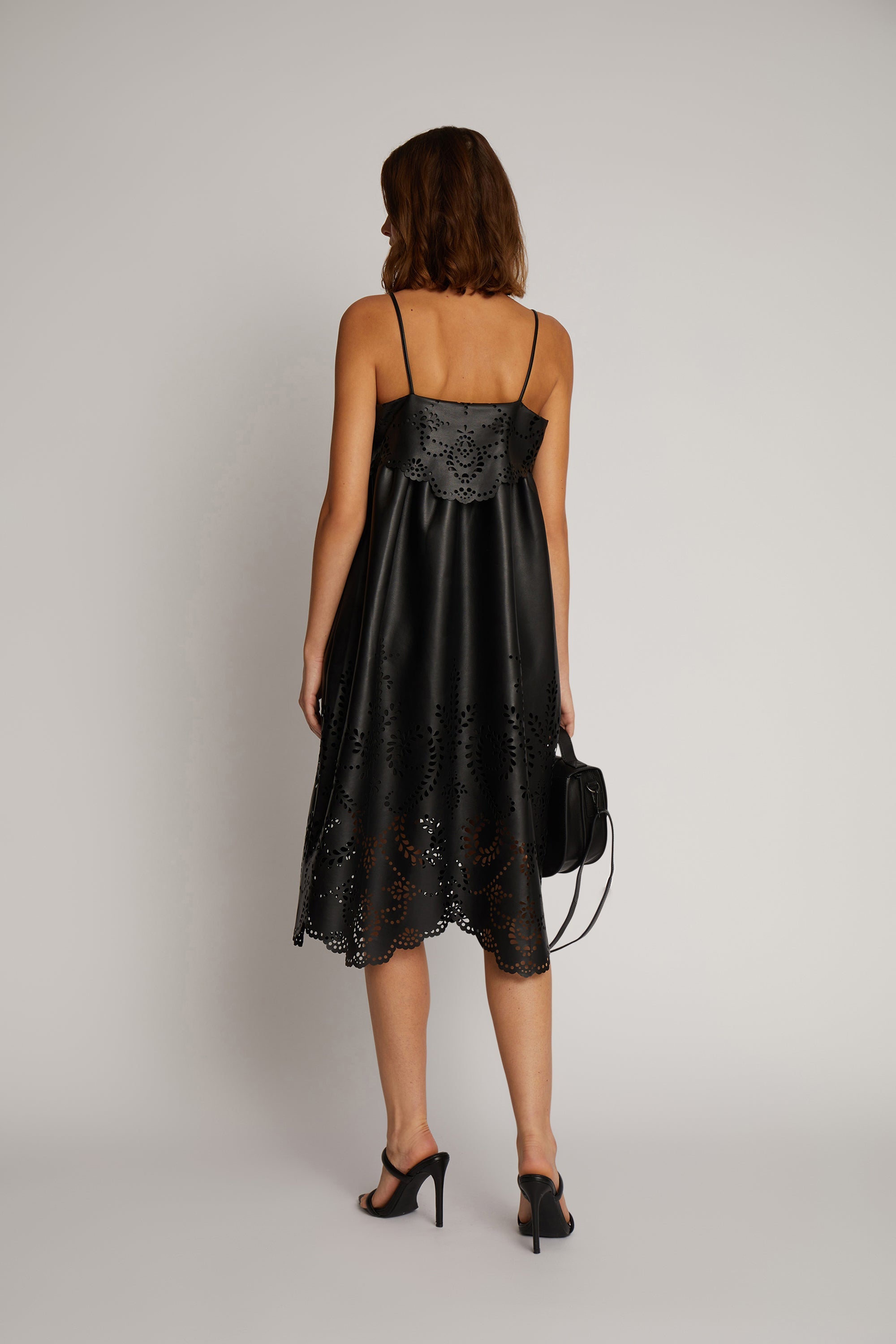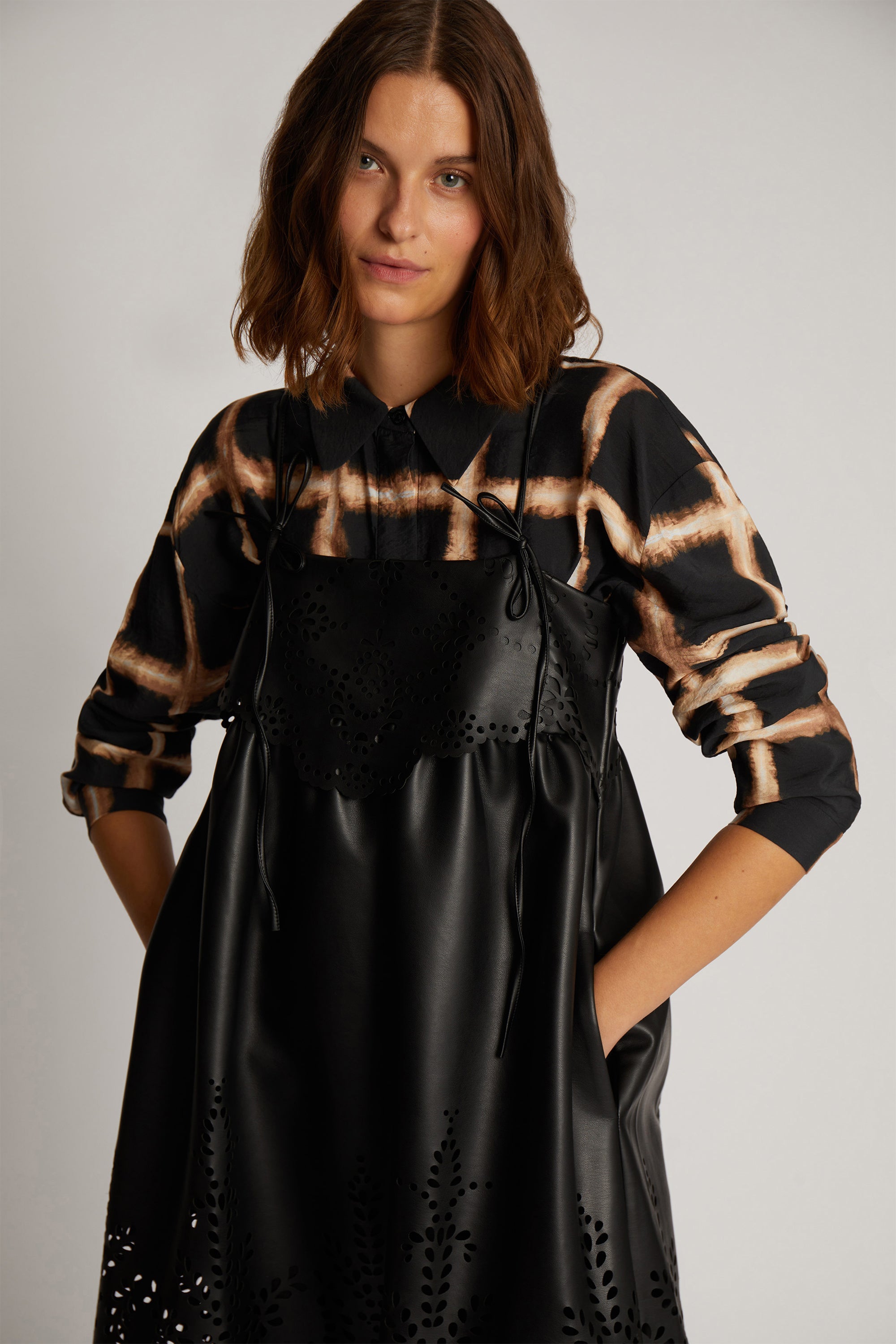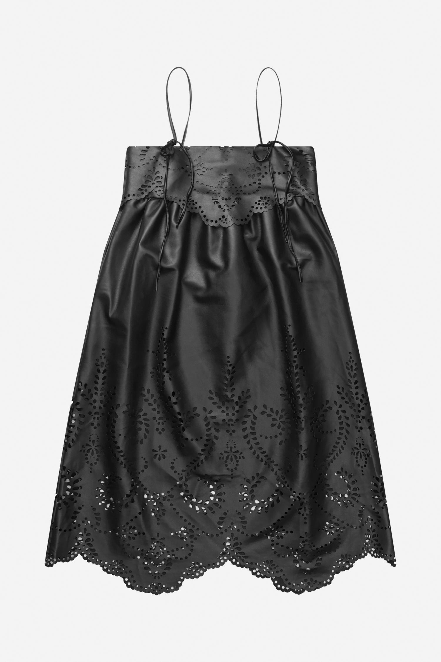 Mellemlang kjole med elegante udskæringer i animal-free læder. Kjolen har en normal pasform, smukke bindebånds detaljer ved brystet, sidelommer og lukkes med en lynlås.