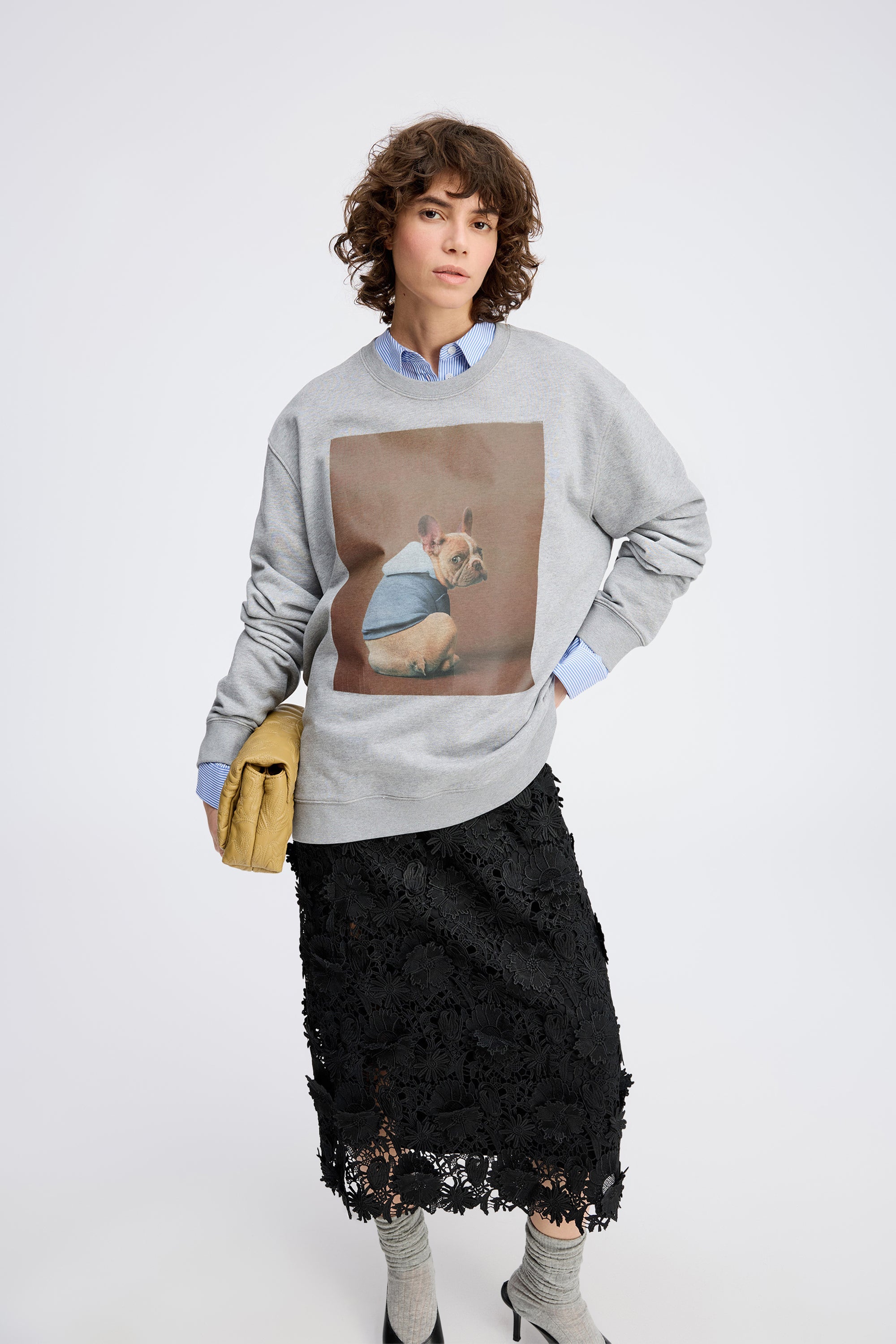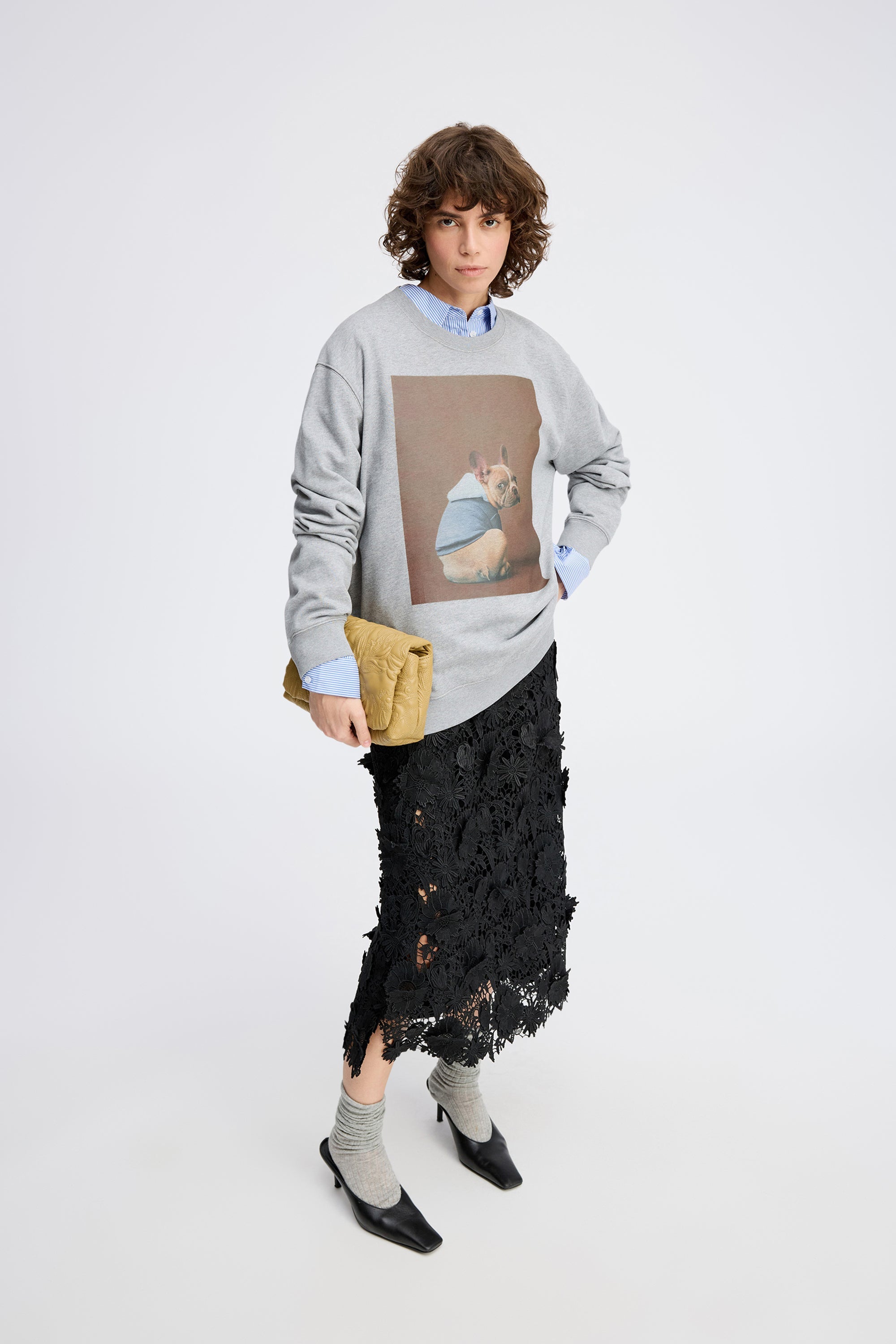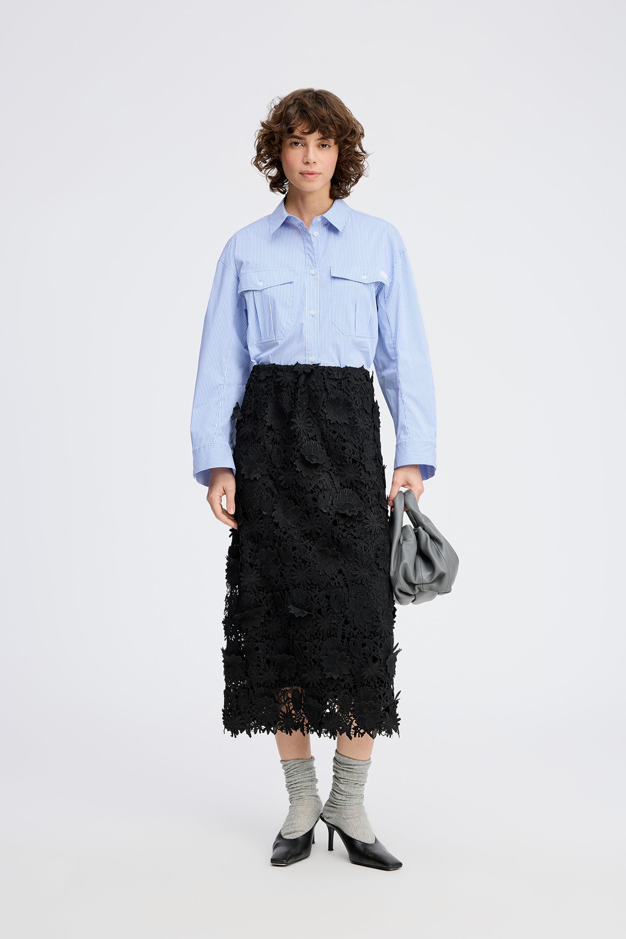 Elegant sort nederdel med smukke blomsterapplikationer. Designet med sort for og delvist gennemsigtige detaljer ved sømmen og siden, den lukkes med en lynlås.