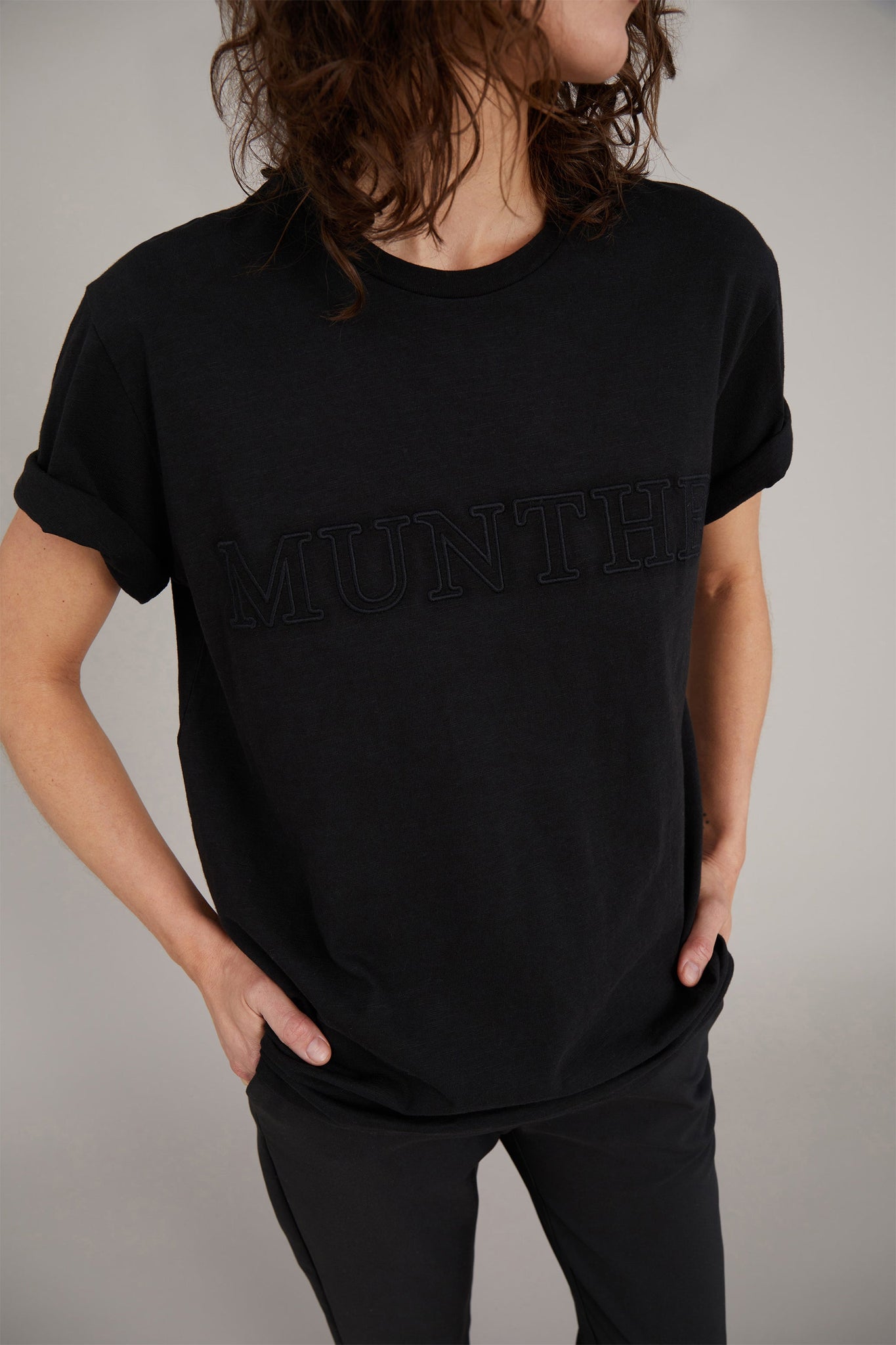 Klassisk t-shirt med et feminint MUNTHE logo broderet på brystet. T-shirten er designet i 100% økologisk bomuld og har en løs pasform. Ærmerne har trekvart længde og kan styles med let oprullede ærmer. T-shirten har en rund hals med en smal rib.