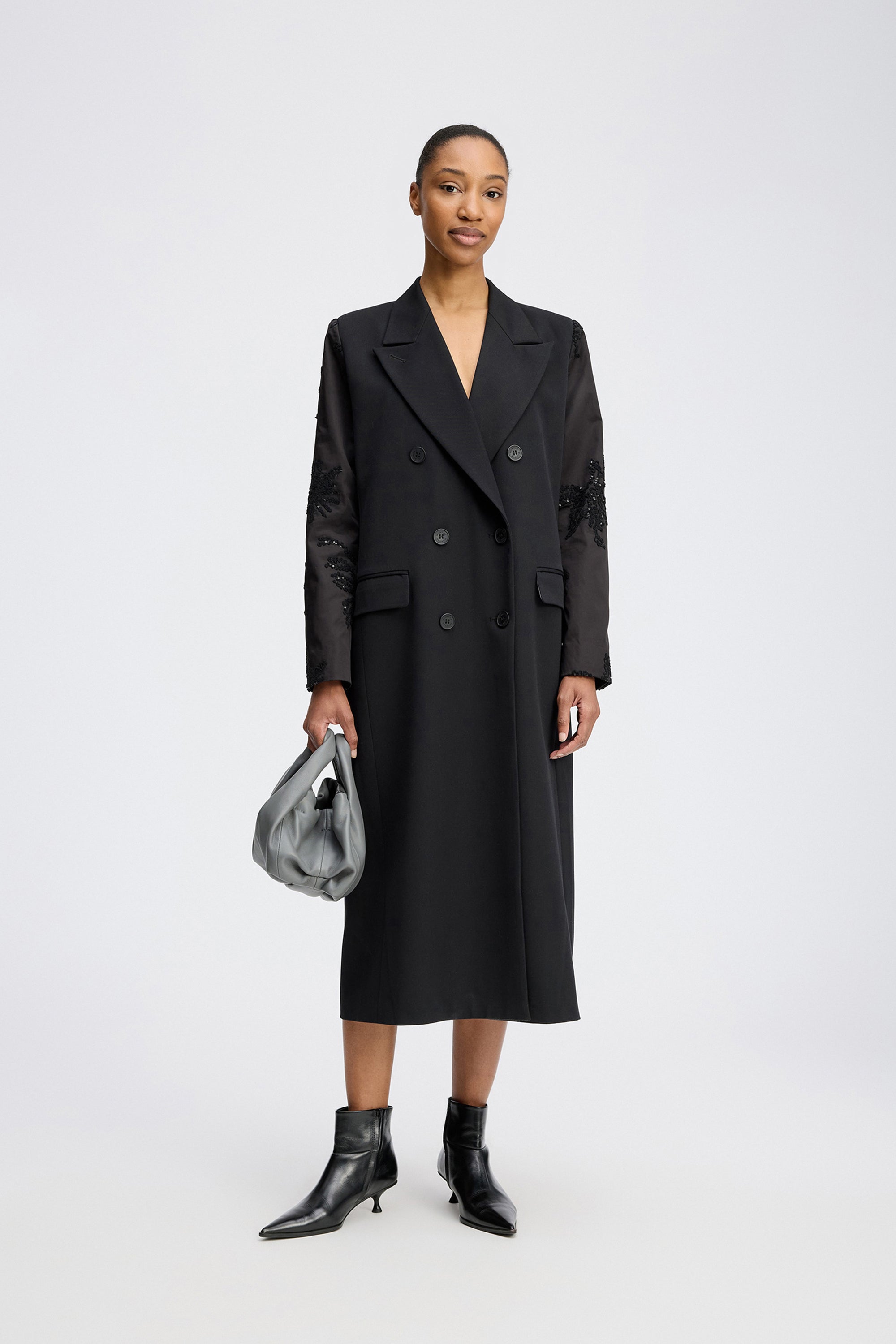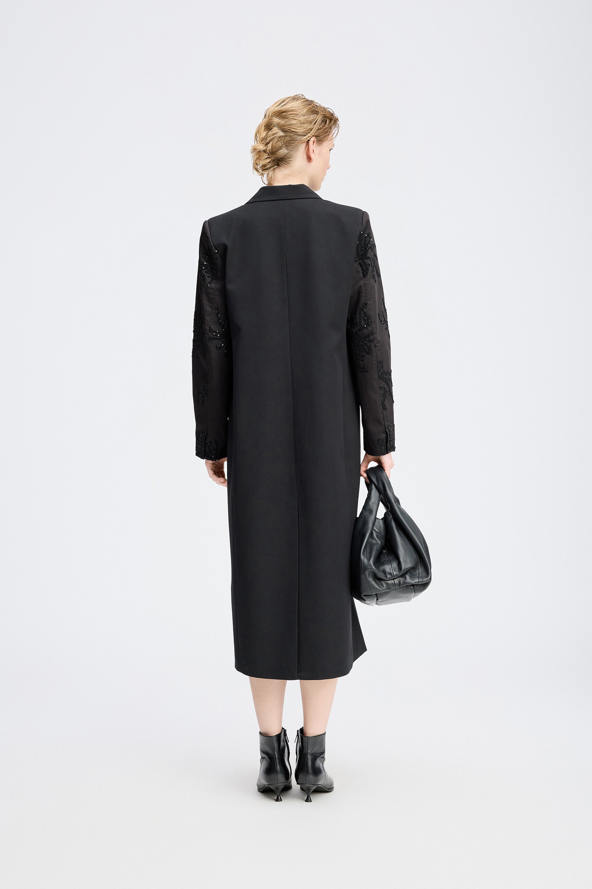 Lang, sort blazerfrakke med dobbeltradet lukning og elegante broderede ærmer prydet med tone-i-tone pailletter og perler. Designet med klassisk revers, klaplommer og en lige, elegant silhuet.