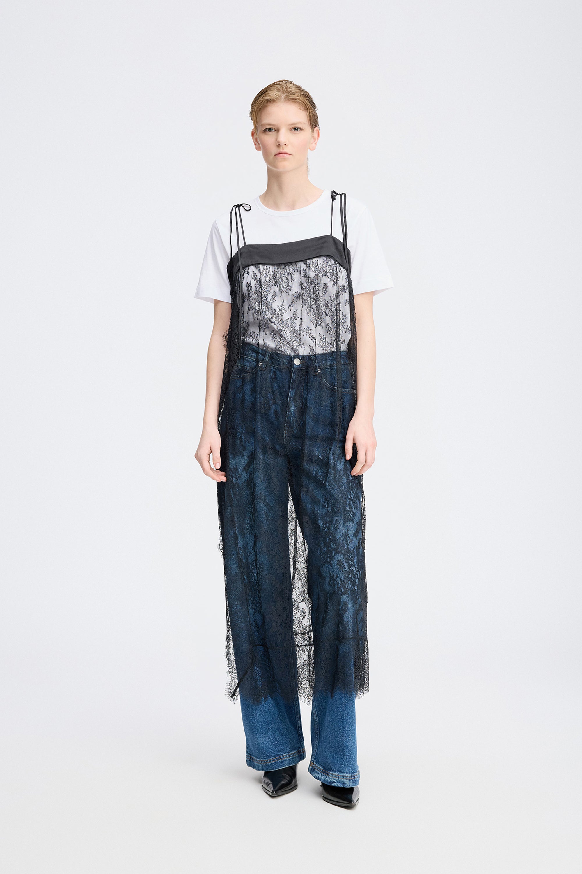 Elegant blondekjole med fine blondekanter. Designet med tynde, justerbare stropper og en asymmetrisk blondeafslutning. Brug den alene eller style den med en Rocco Slip under.