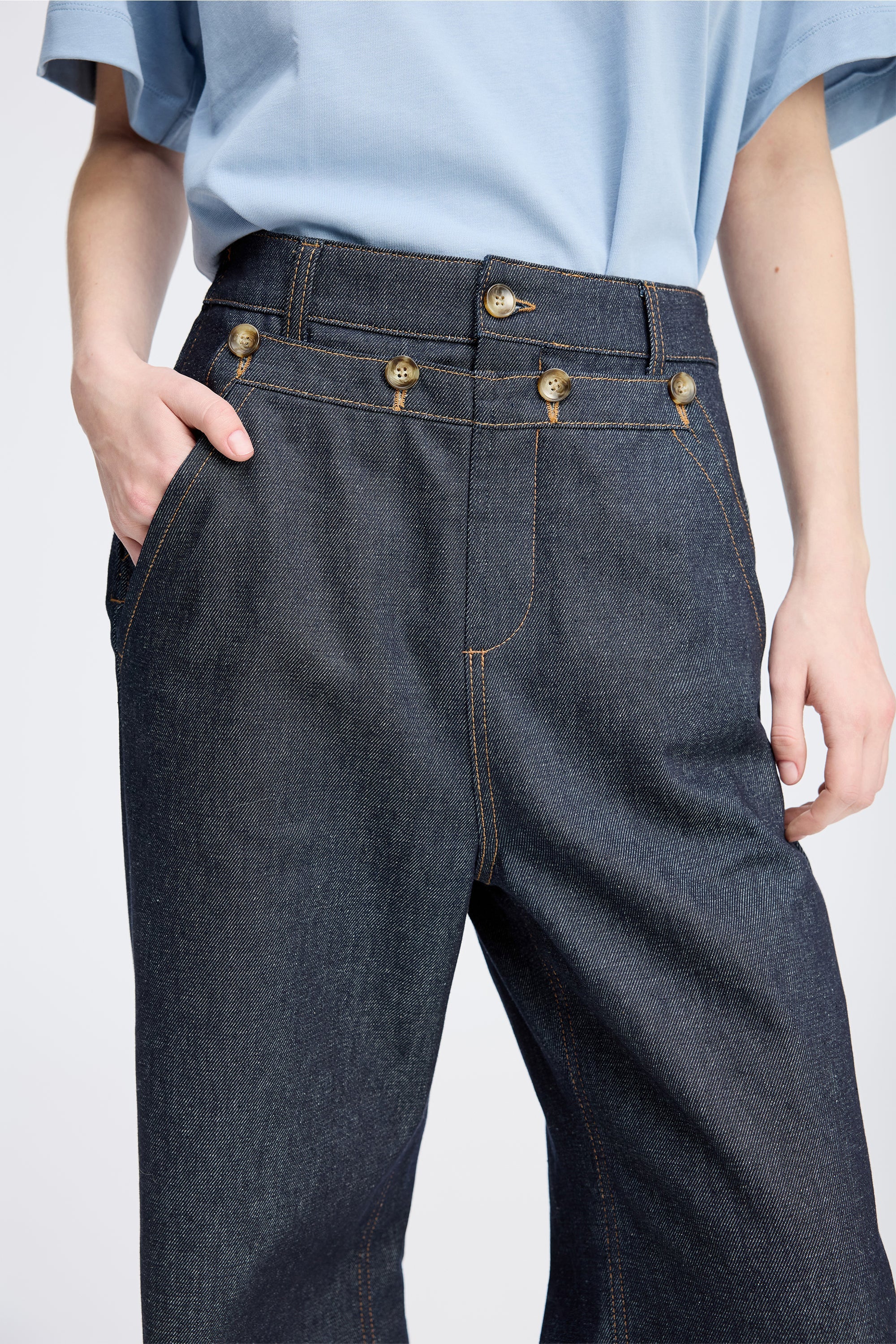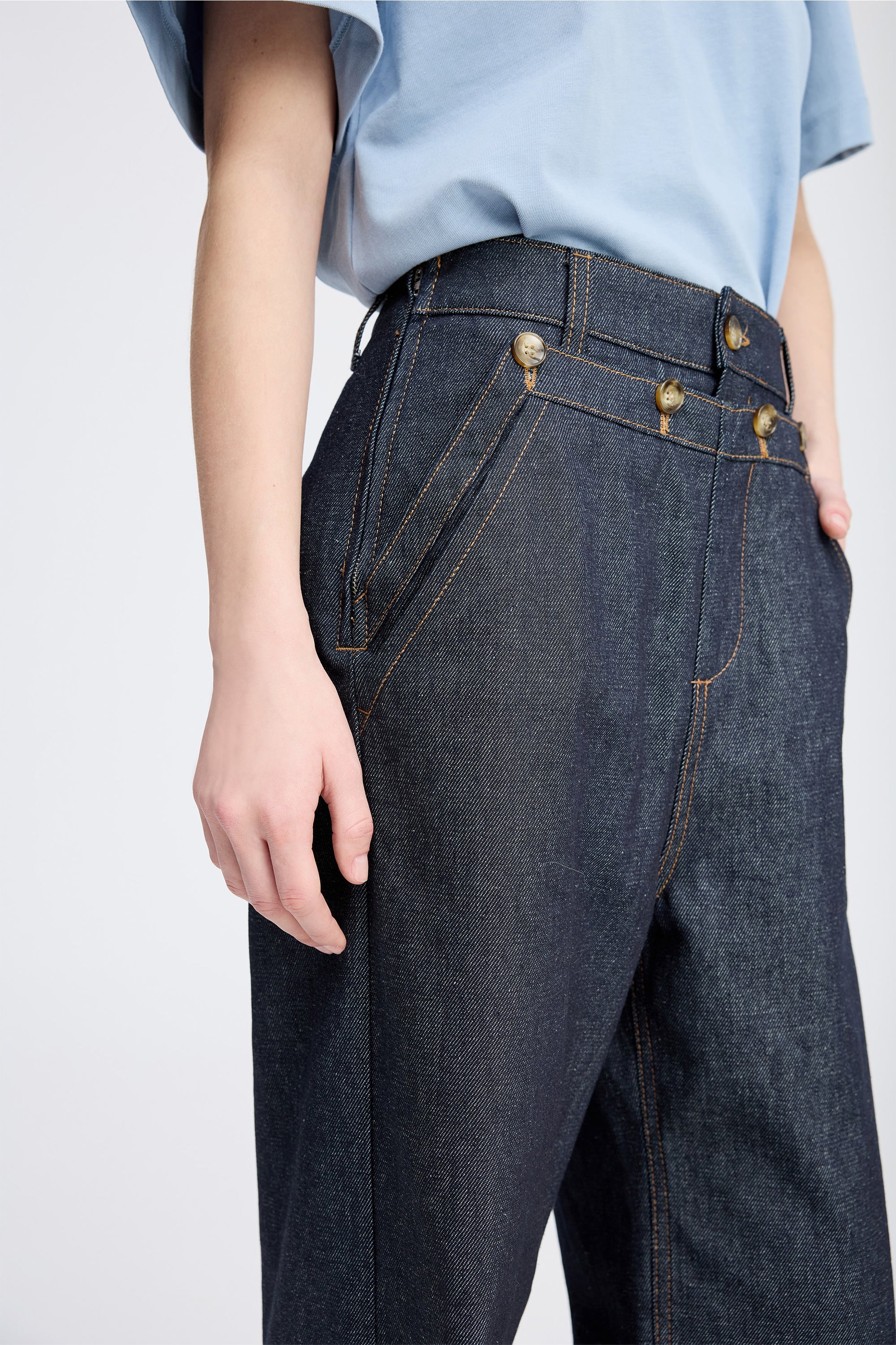Elegante jeans med høj talje og unikke knapdetaljer foran, som giver et moderne twist til et tidløst look. Disse jeans er designet med lynlås i siden, bæltestropper og lommer bagpå.