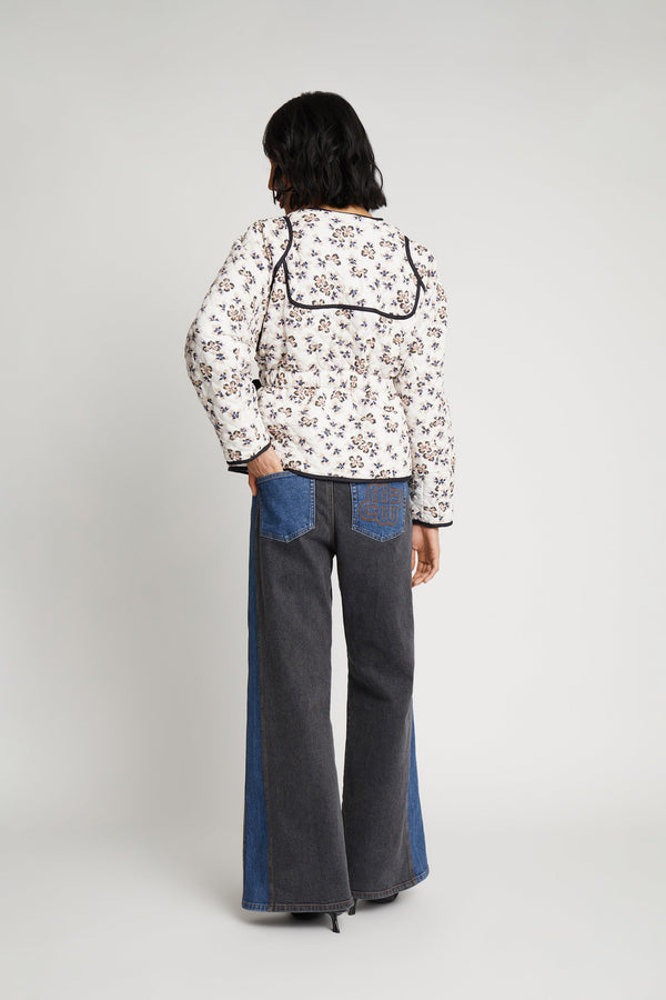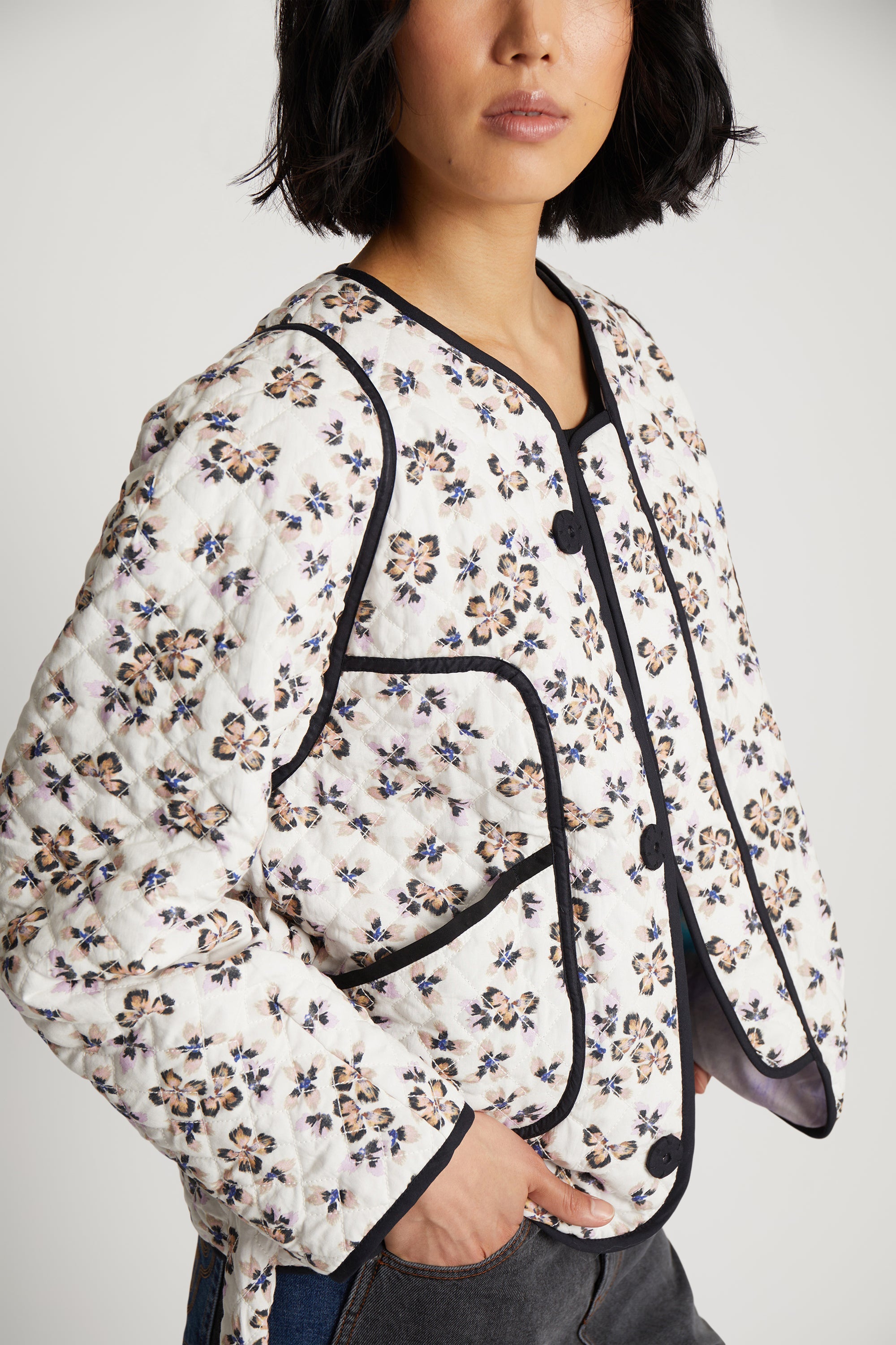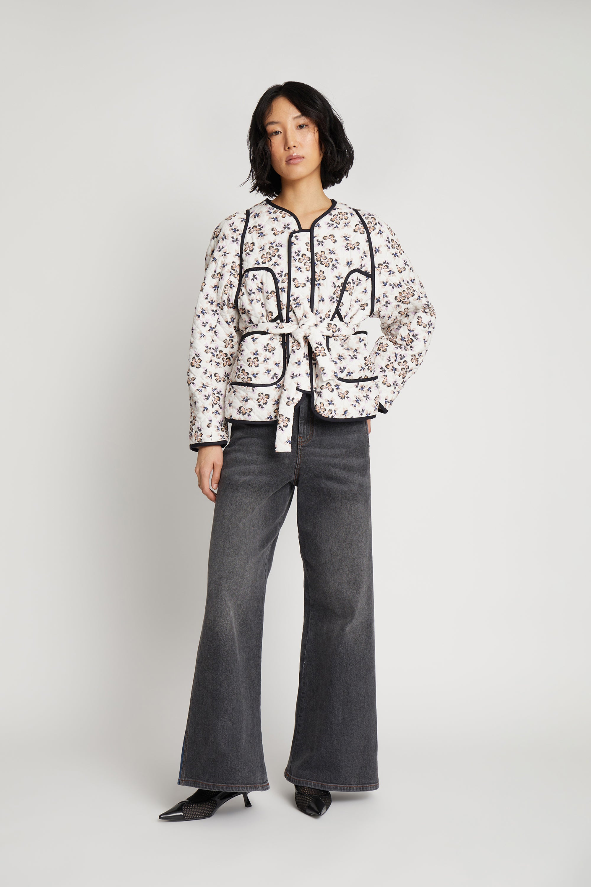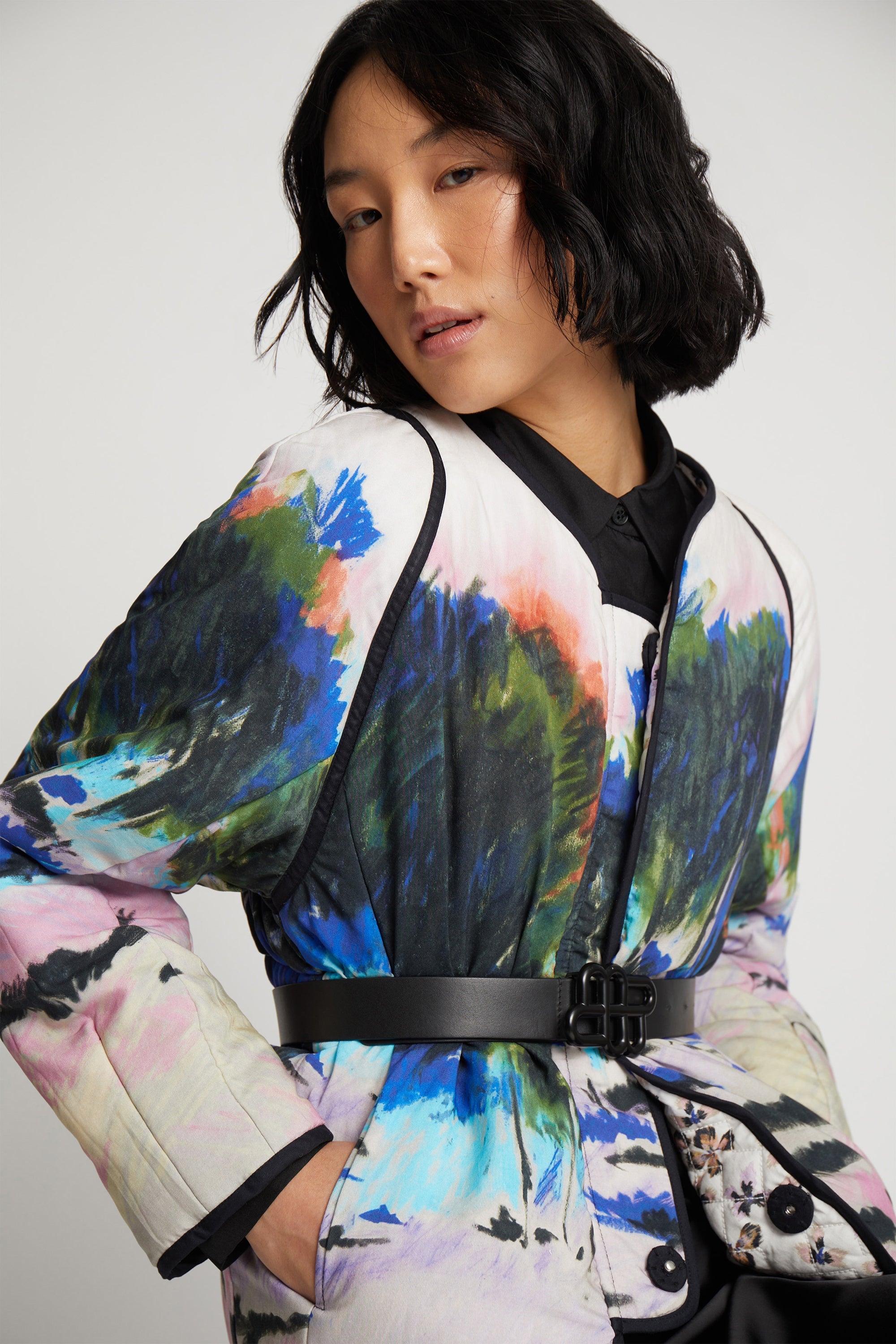 En smuk, alsidig og vatteret jakke, designet med mulighed for at vende jakken og opnå et farveskift. Jakken har et elegant all-over blomsterprint med et matchende bælte på den ene side og et smukt kunstnerisk landskabsprint på den anden side. Denne jakke er lavet med lommer og en skjult knaplukning foran.
