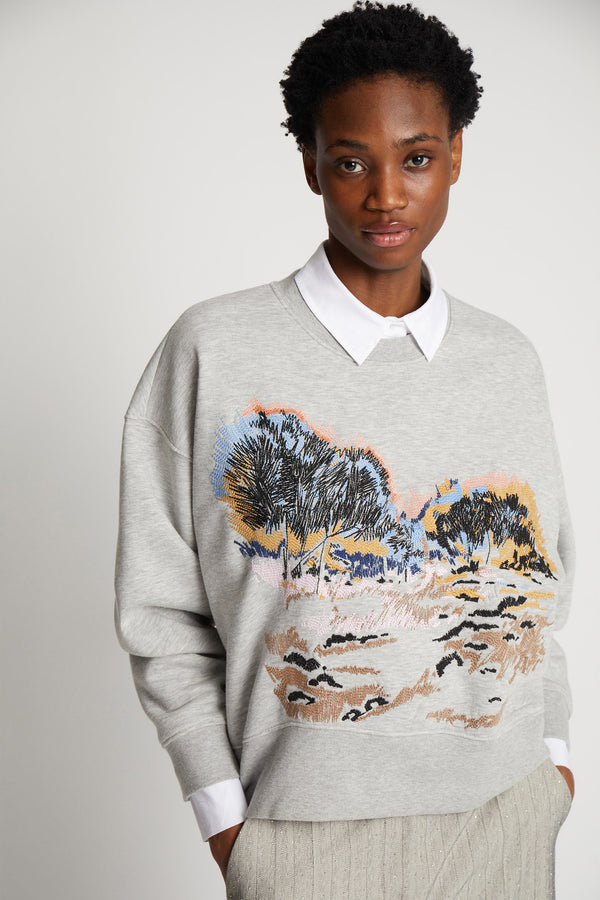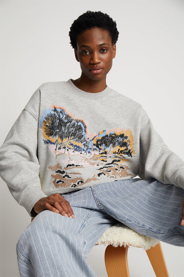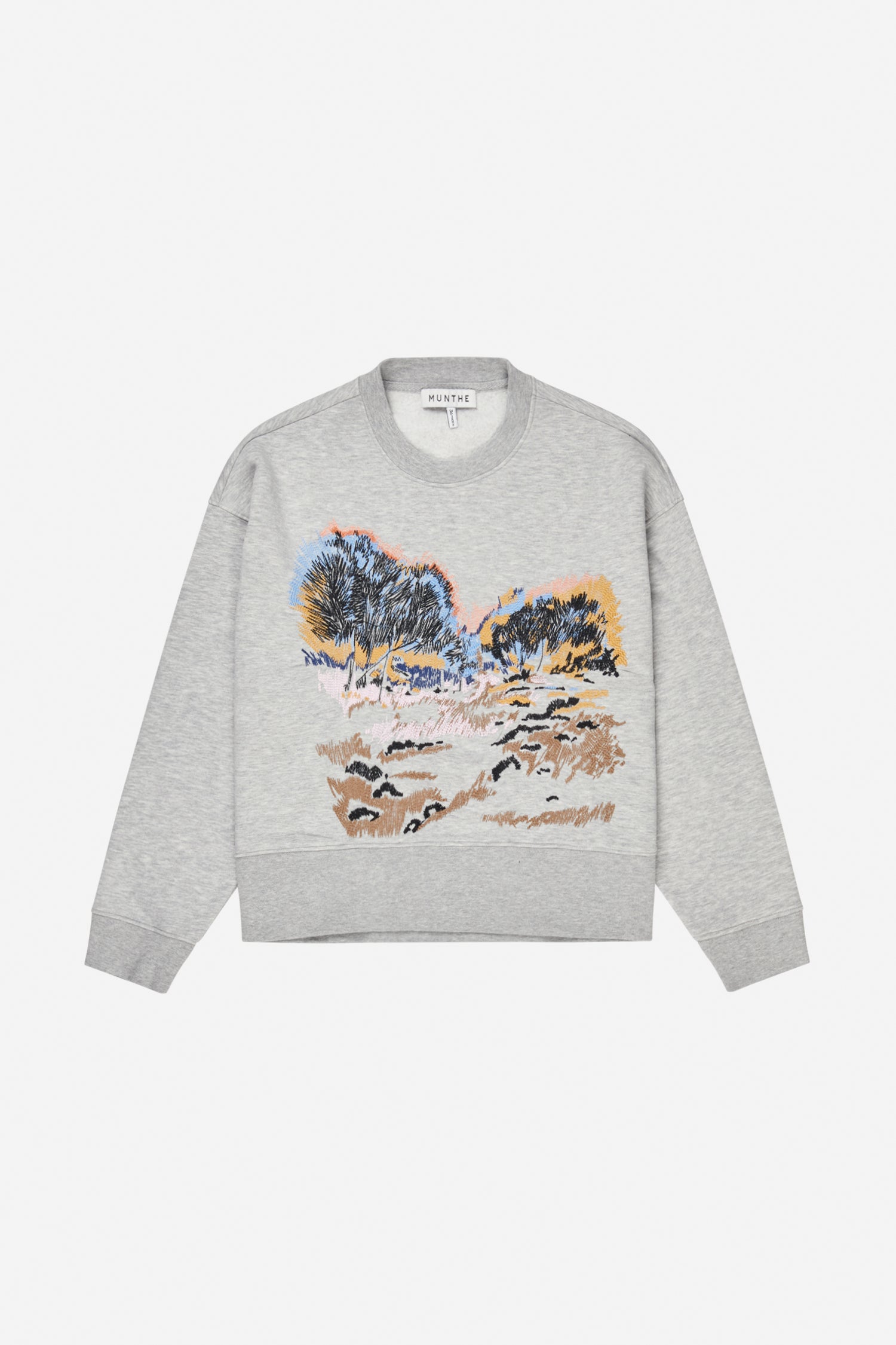 Blød sweatshirt med et elegant kunstbroderi. Denne sweatshirt er designet til en løs pasform med faldende skuldre og en rund halsudskæring.
