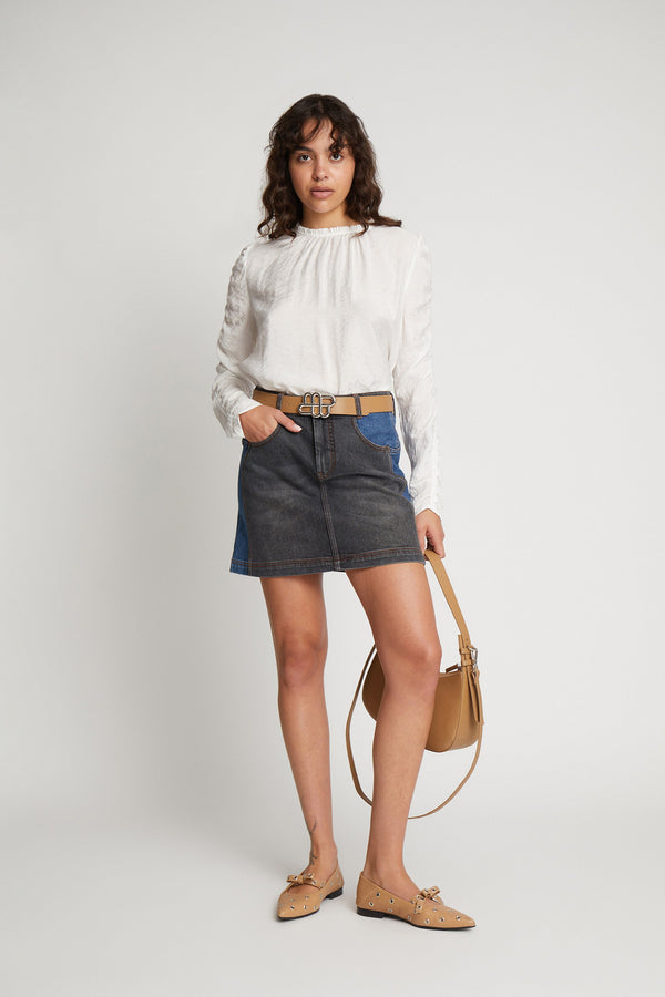 Smuk bluse designet med en elegant flæse detalje ved halsen. Blusen har lange ærmer med en elegant snøre detaljer på siden af ​​ærmerne.