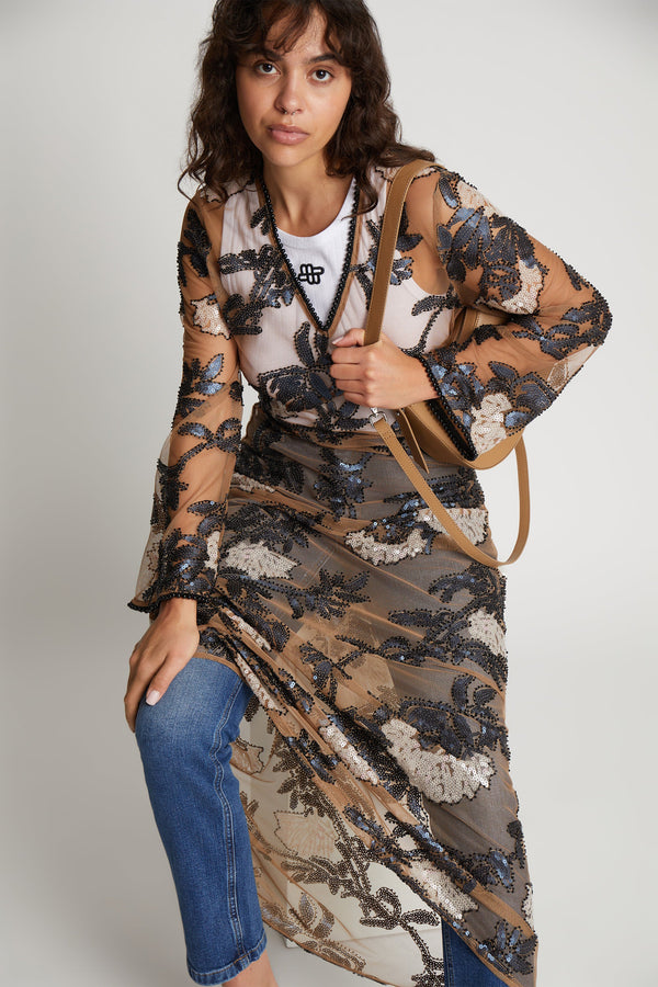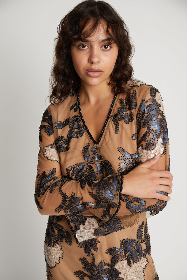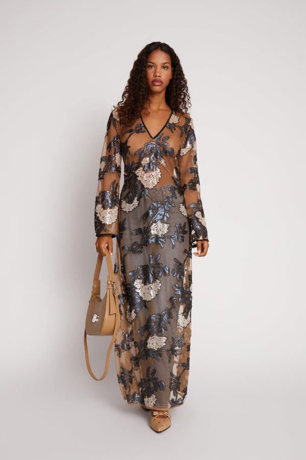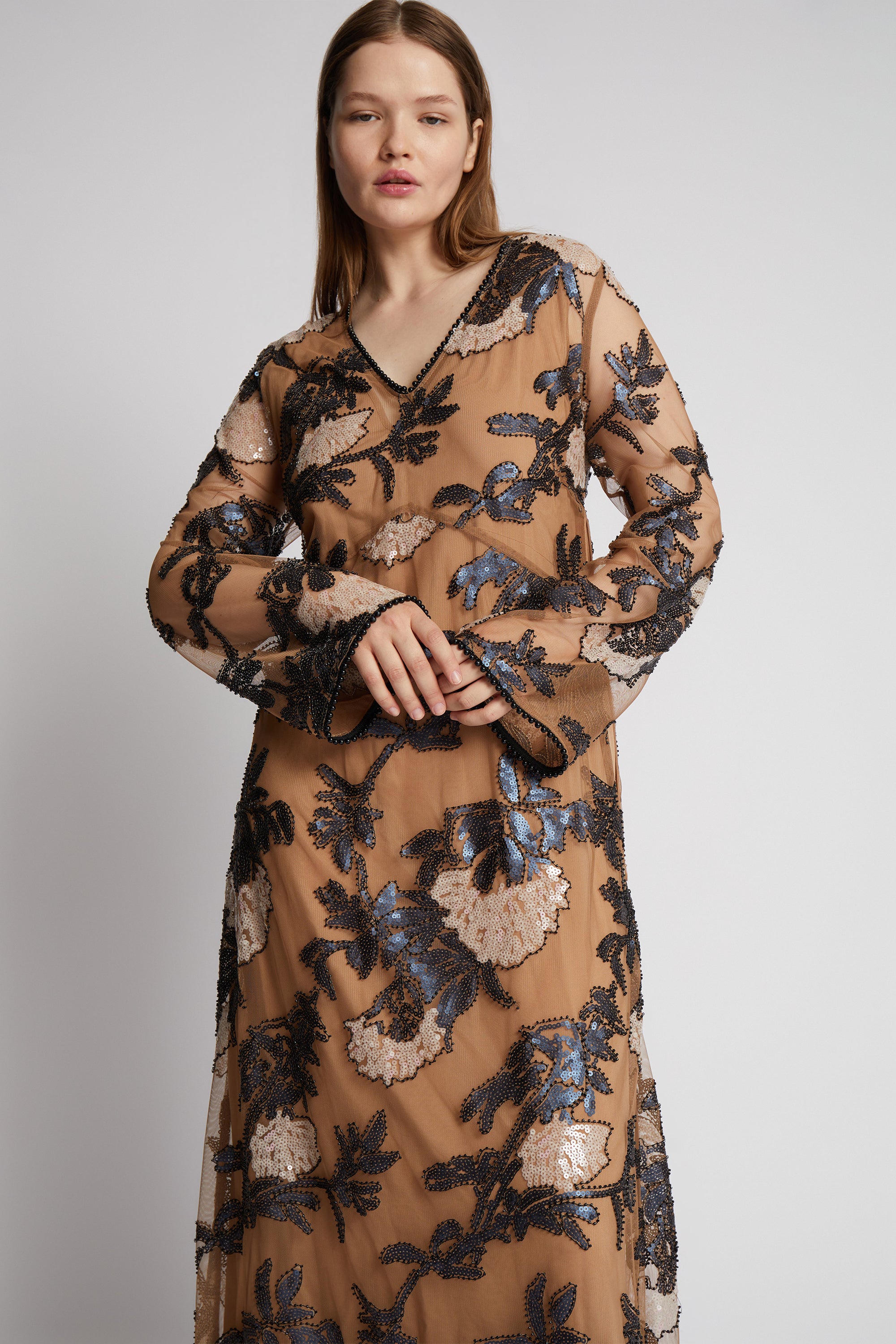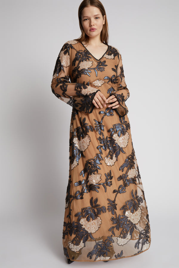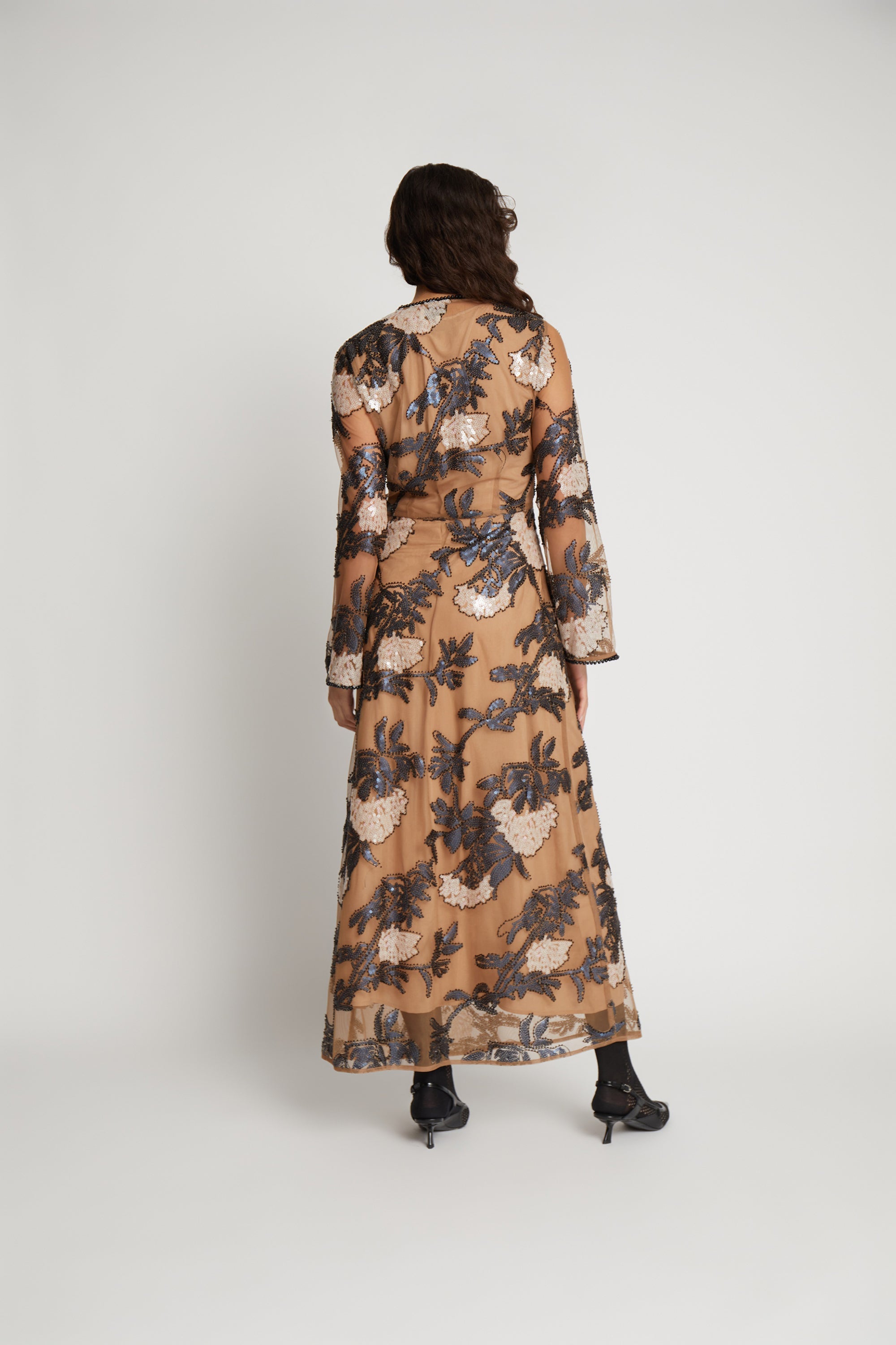 En smuk kjole med et all-over perle og paillet blomster broderi. Kjolen har elegante sorte perler langs kanterne af den smukke v-hals, samt ved afslutningen af ærmerne. Denne kjole er designet med en aftagelig underkjole for at skabe flere styling muligheder.