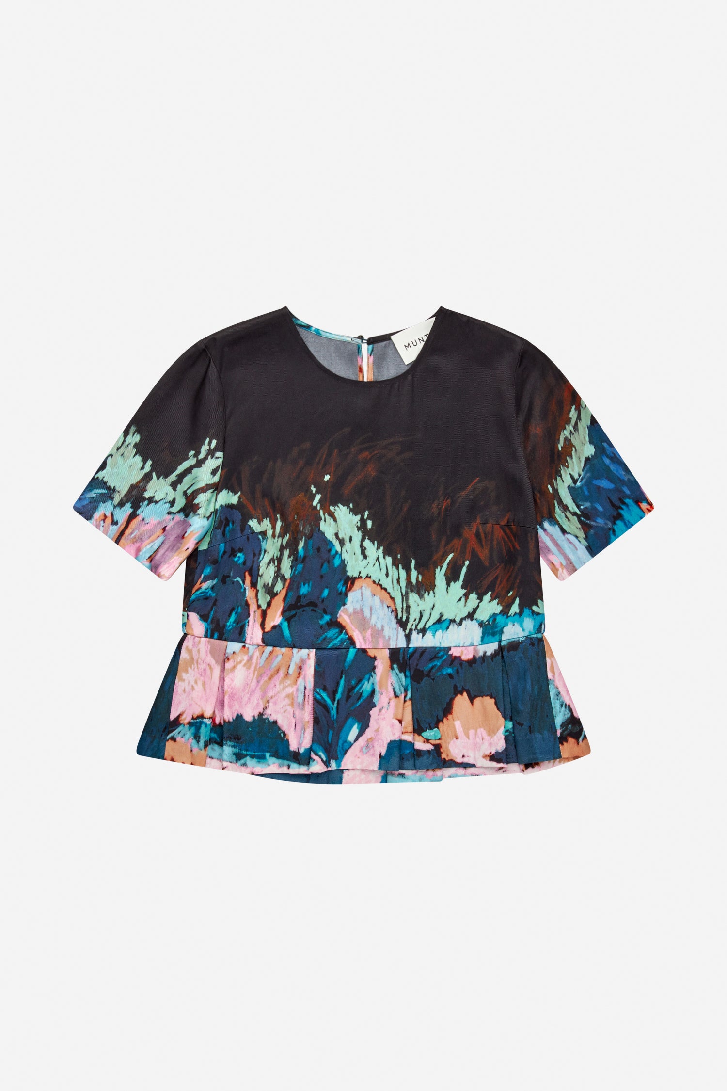 Bluse med et smukt kunstprint, designet med en elegant peplum effekt, rund hals og korte ærmer.