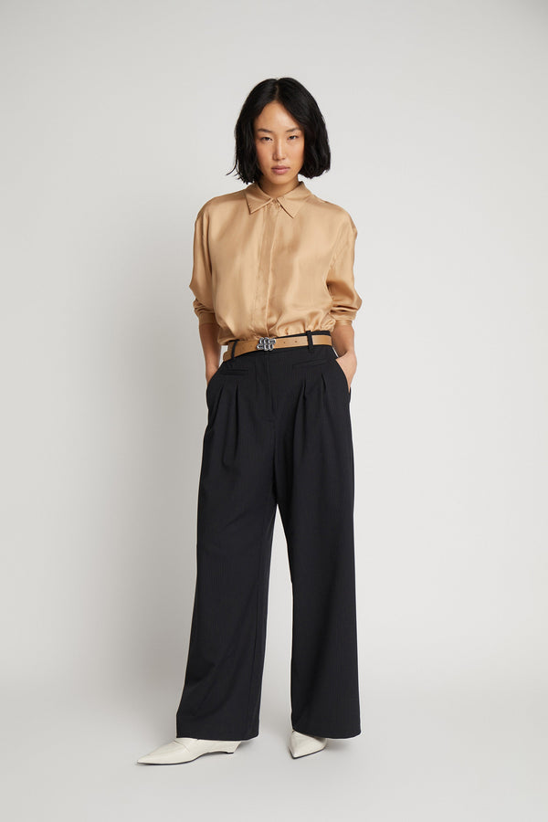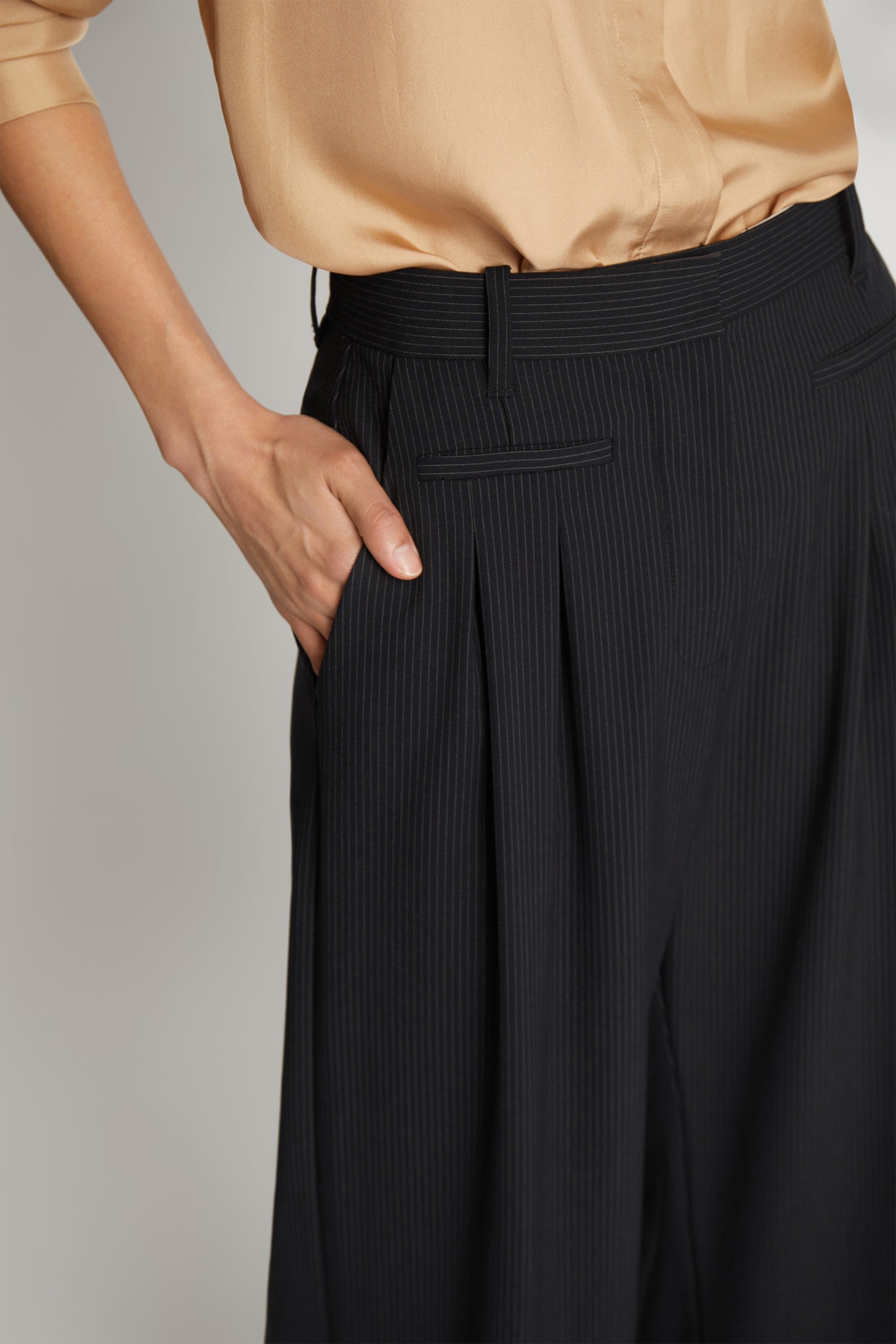 Smukke nålestribede bukser, designet med elegante læg. Disse bukser har lommer i siderne og er lavet til en løs pasform.