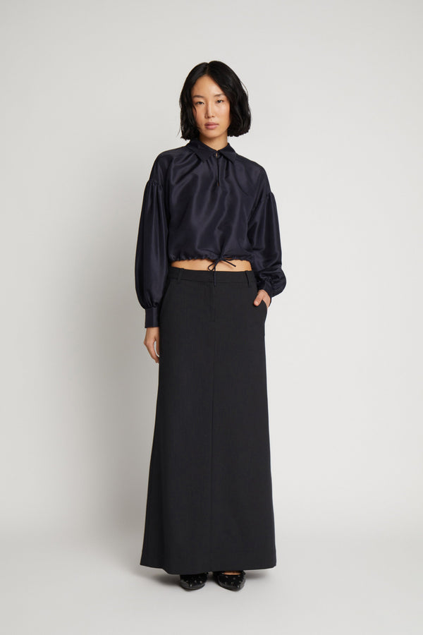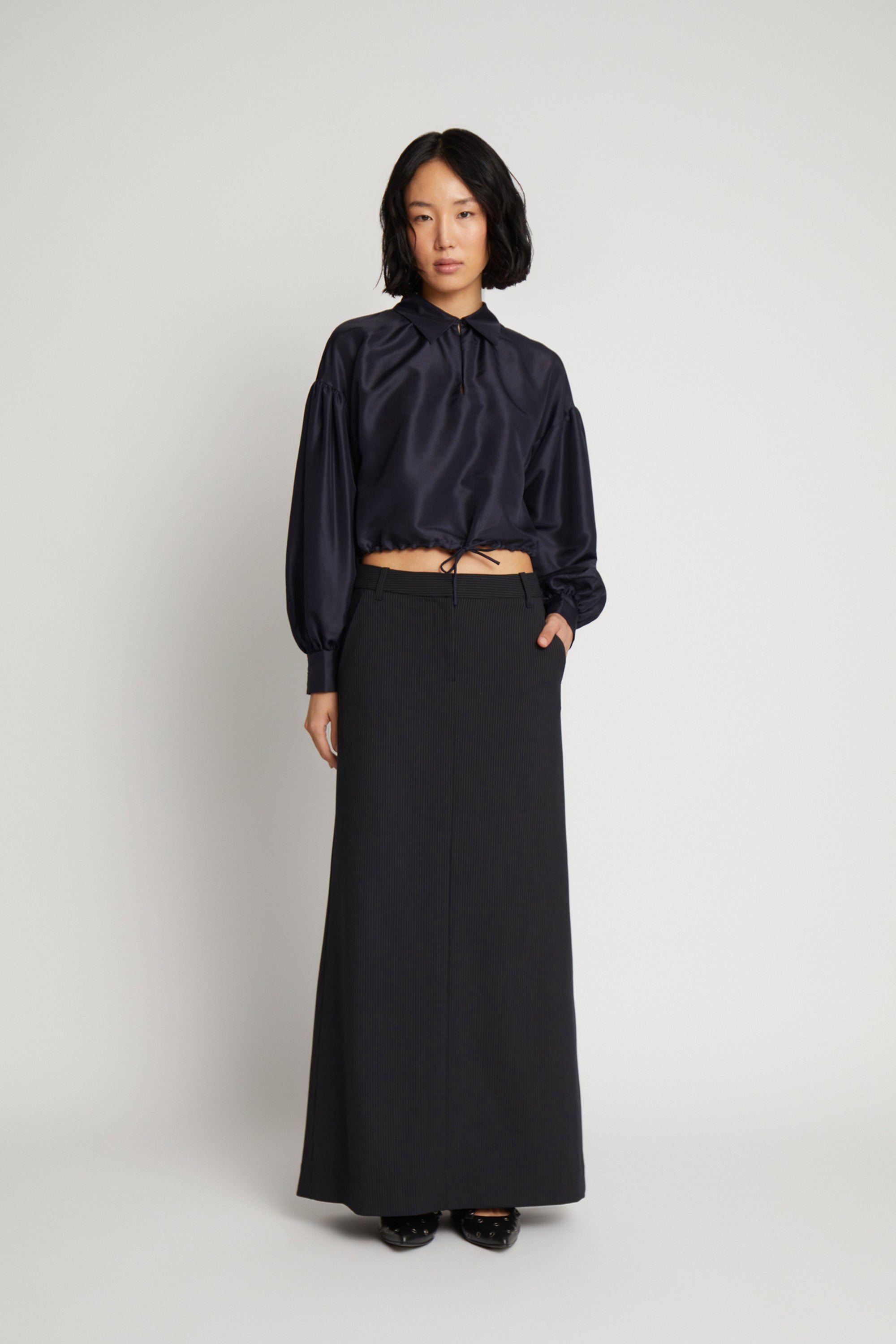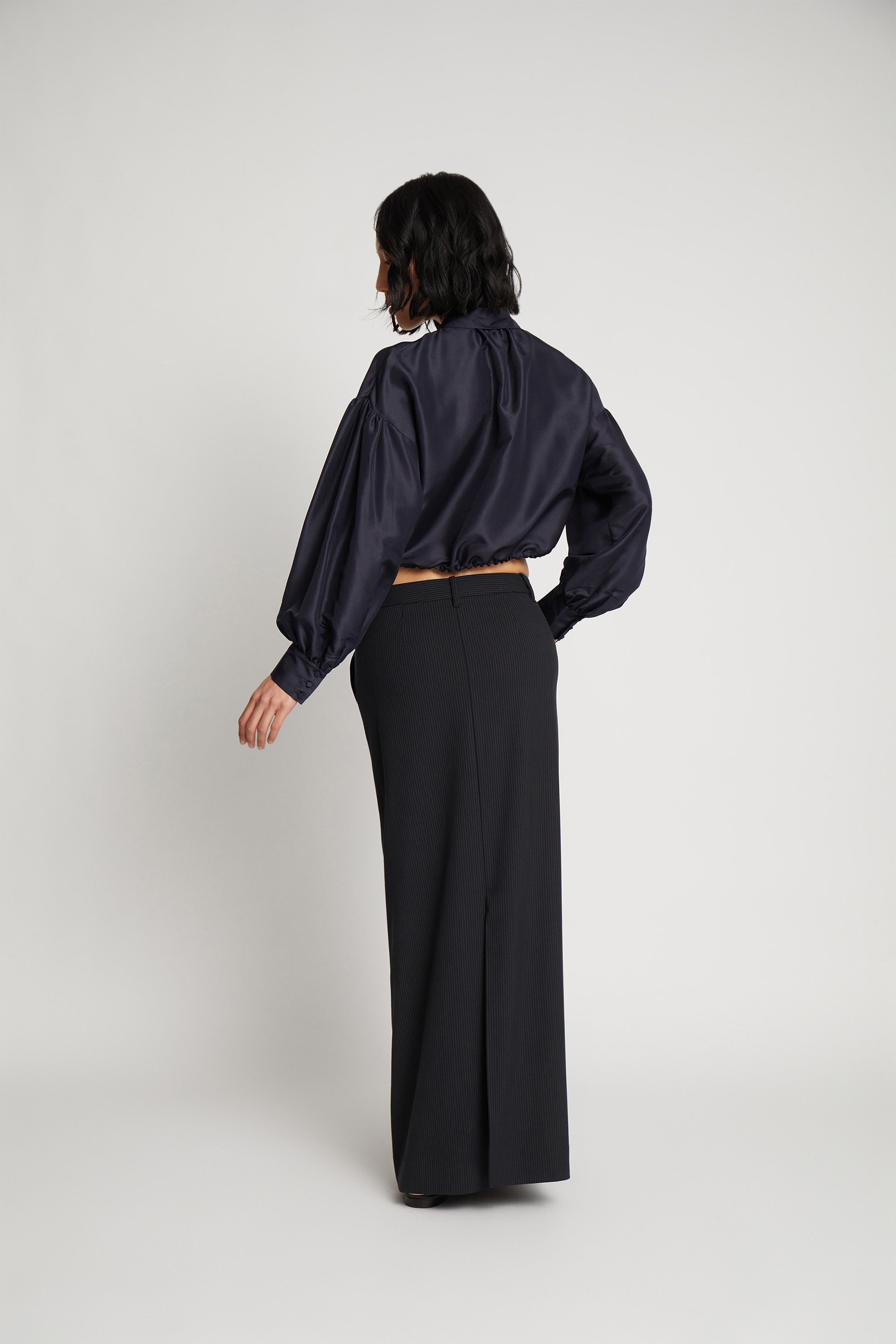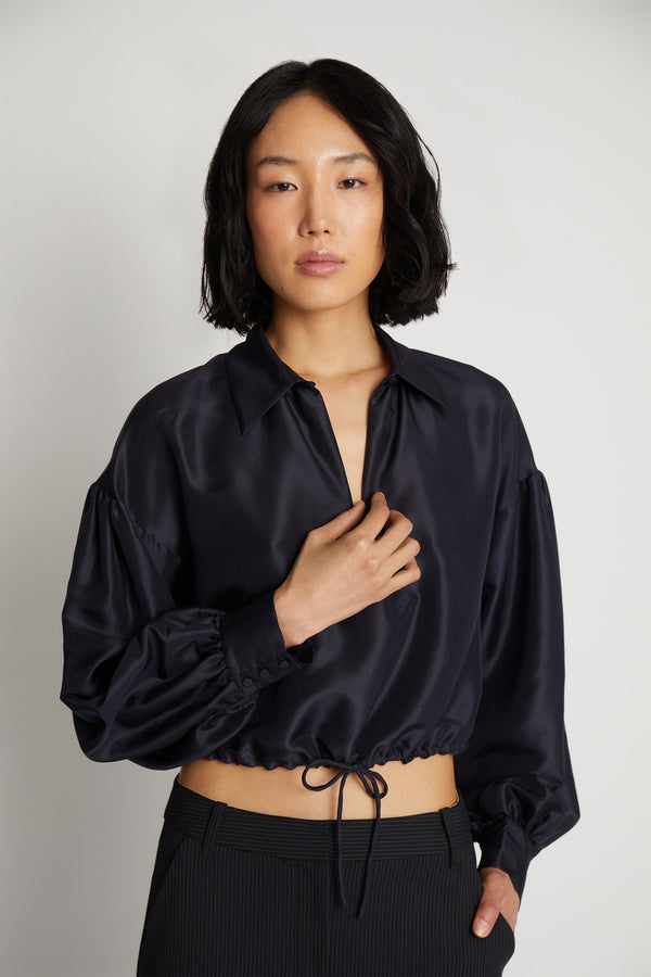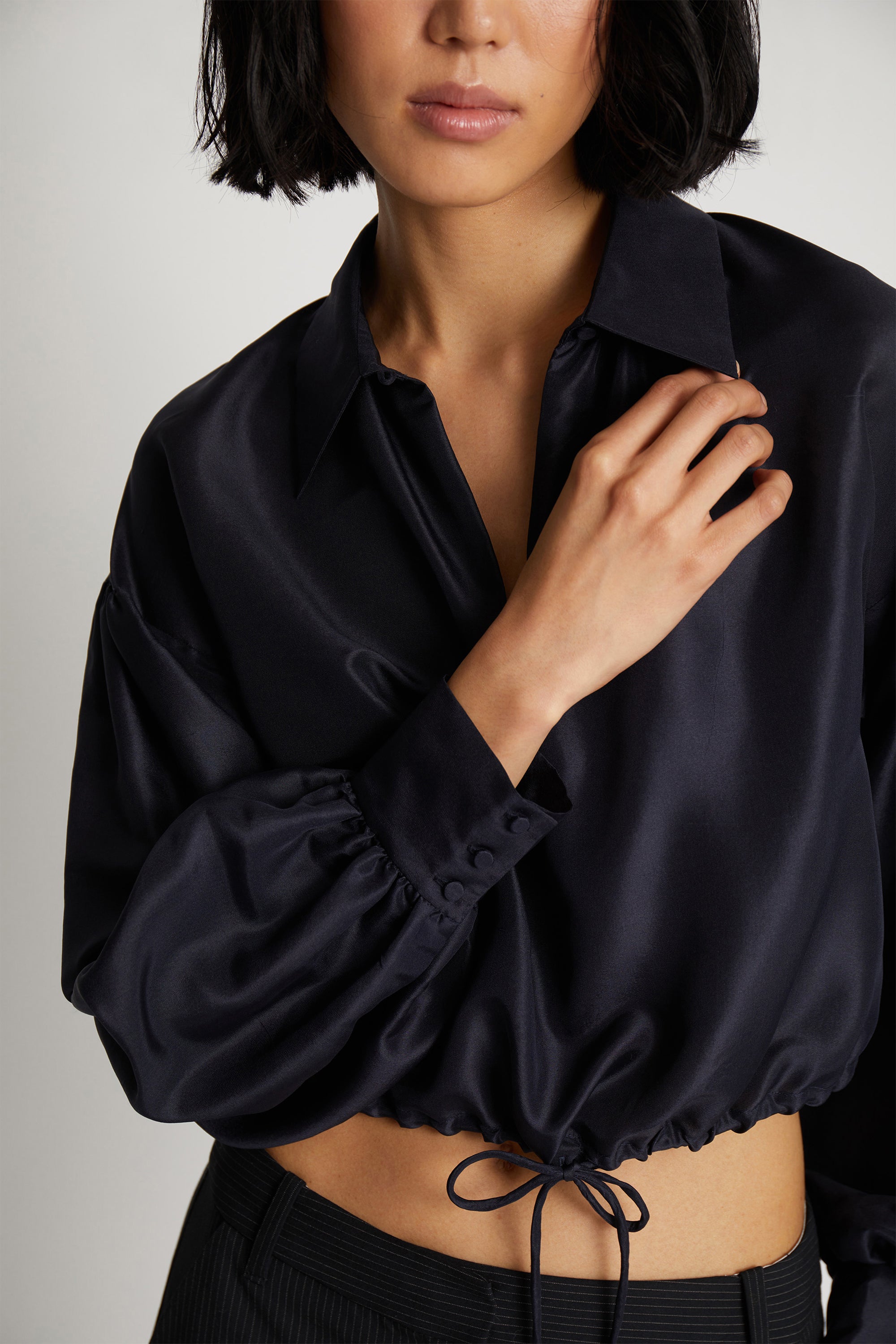 En cropped, alsidig silke skjorte med en smuk snørre detalje nederst. Skjorten har lange ærmer med et lille puf og elegante manchetter.