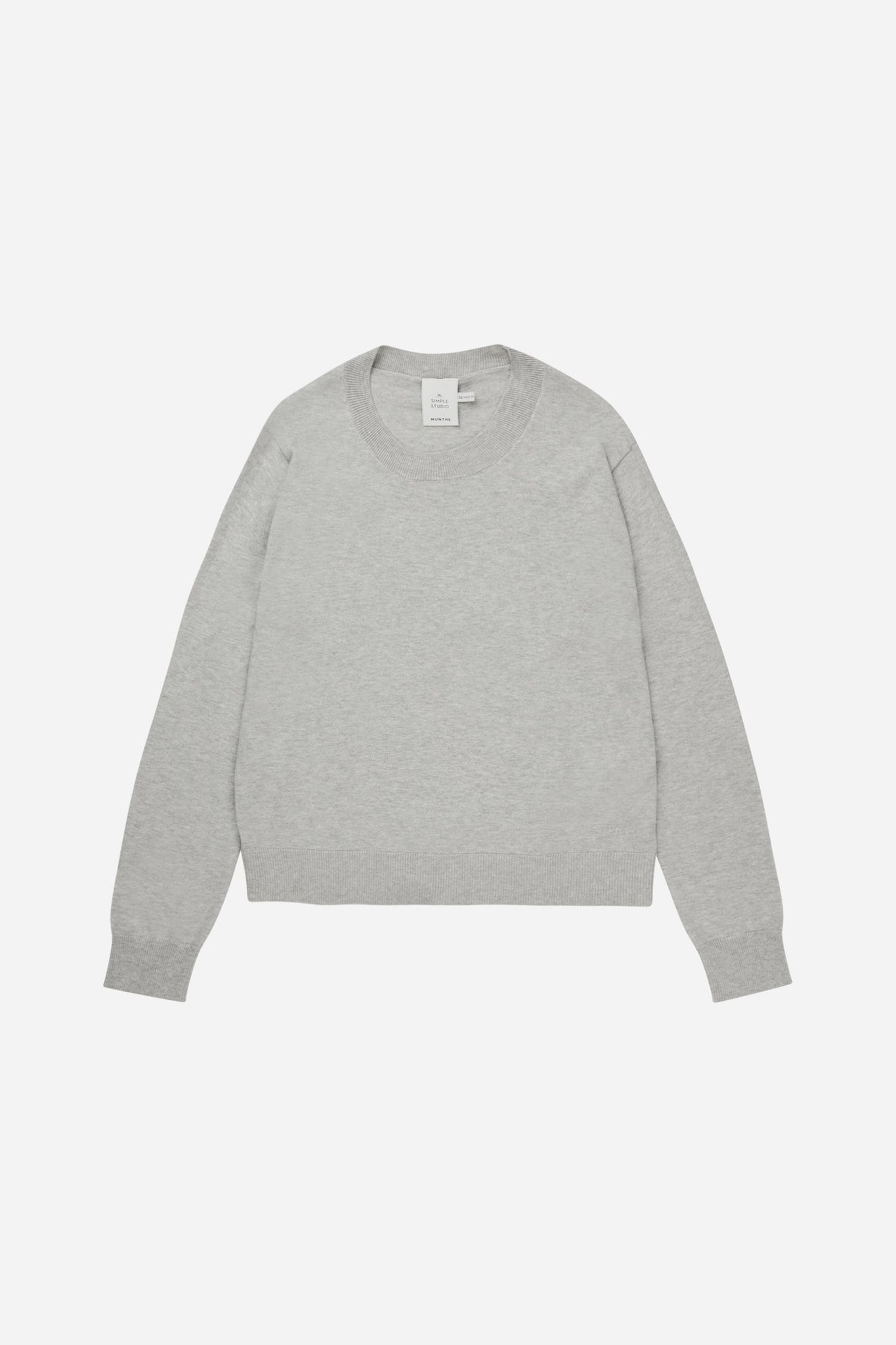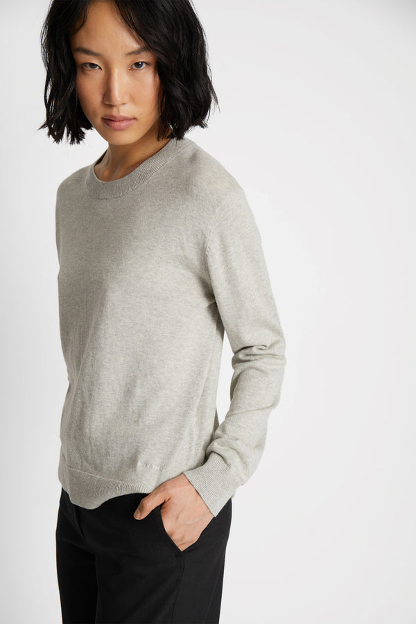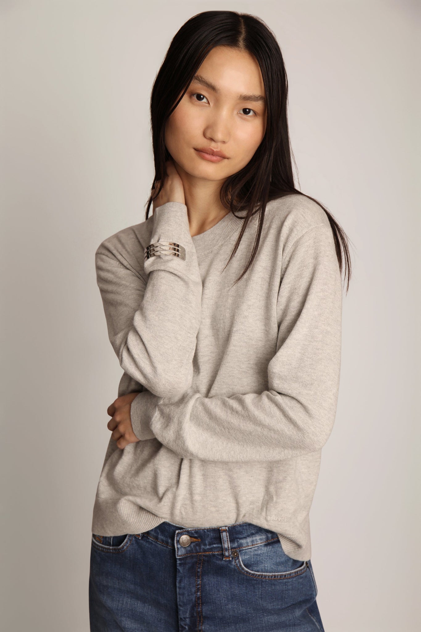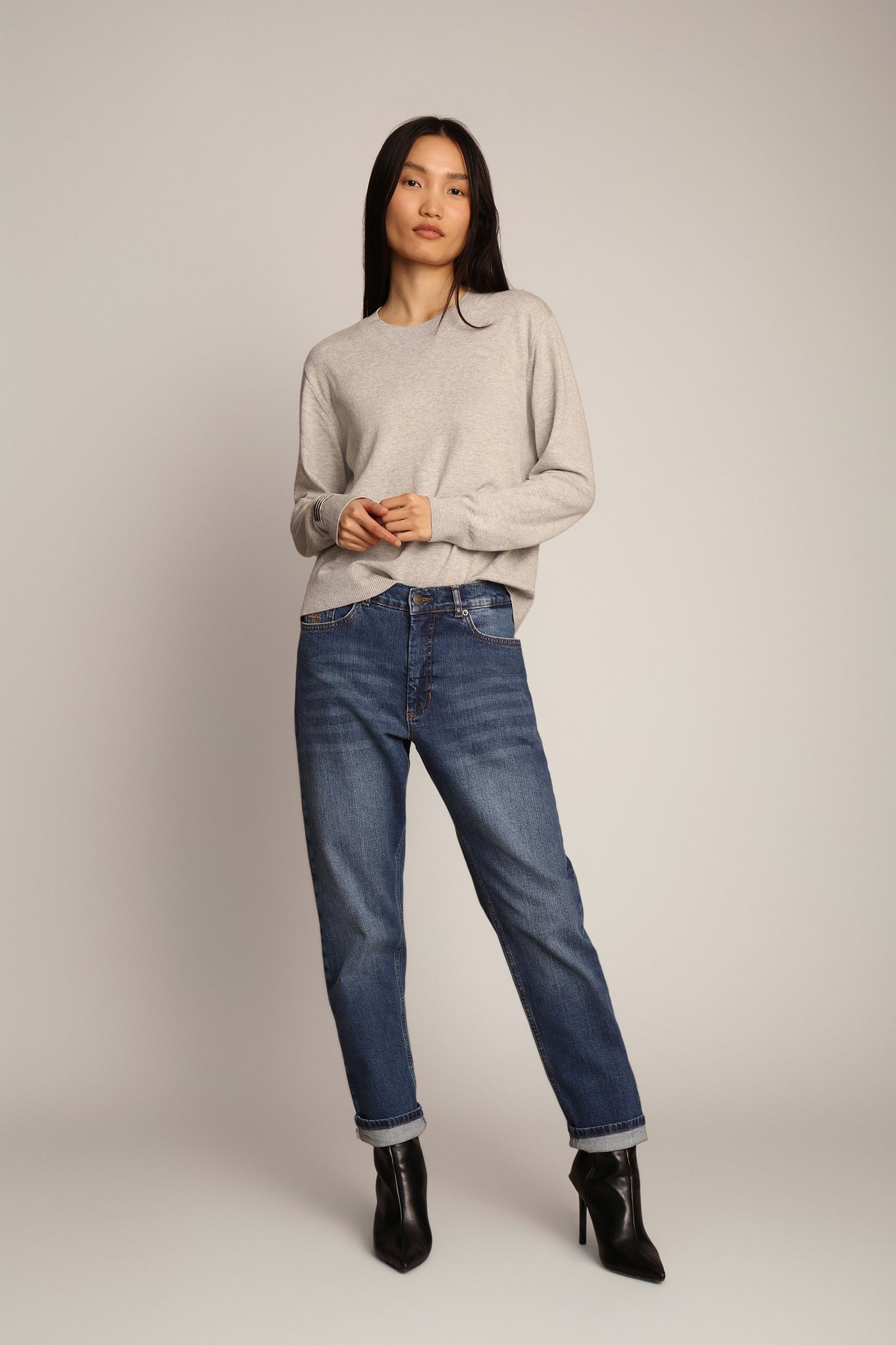 Klassisk let strik lavet af en blød merinould blanding. Denne strik har lange ærmer, en rund halsudskæring og en elegant rib langs kanterne.
