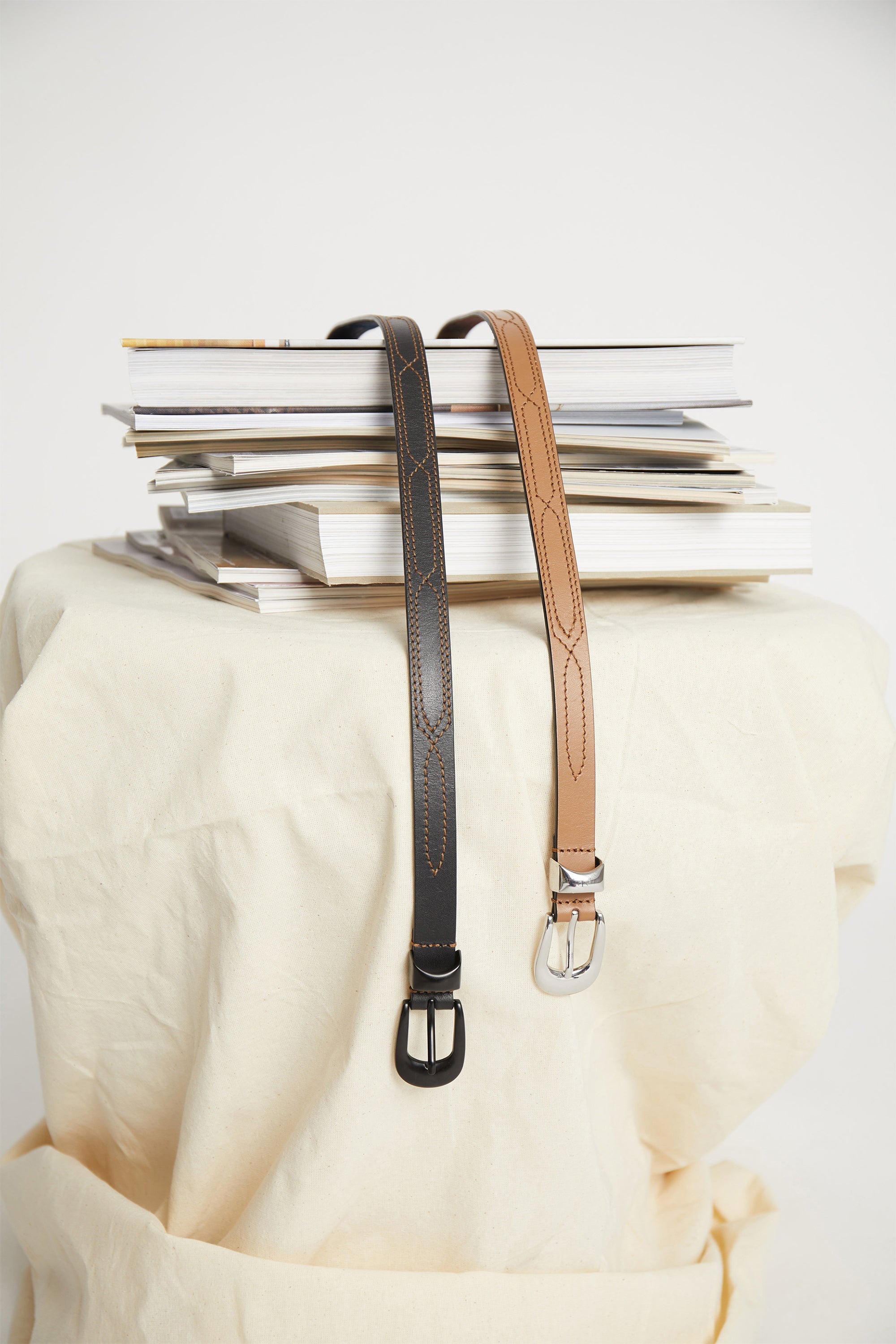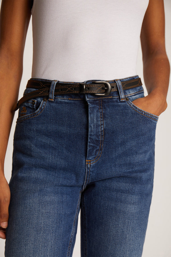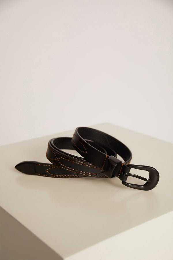 Et tyndt, smukt bælte i 100% læder med all-over western-inspirerede syninger og en elegant bæltespids. Fås i farverne Camel eller Sort.