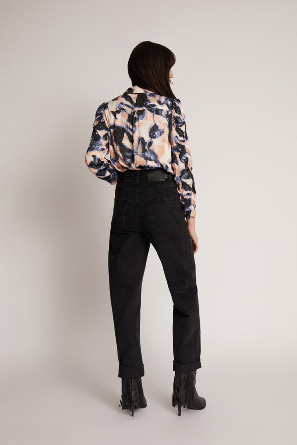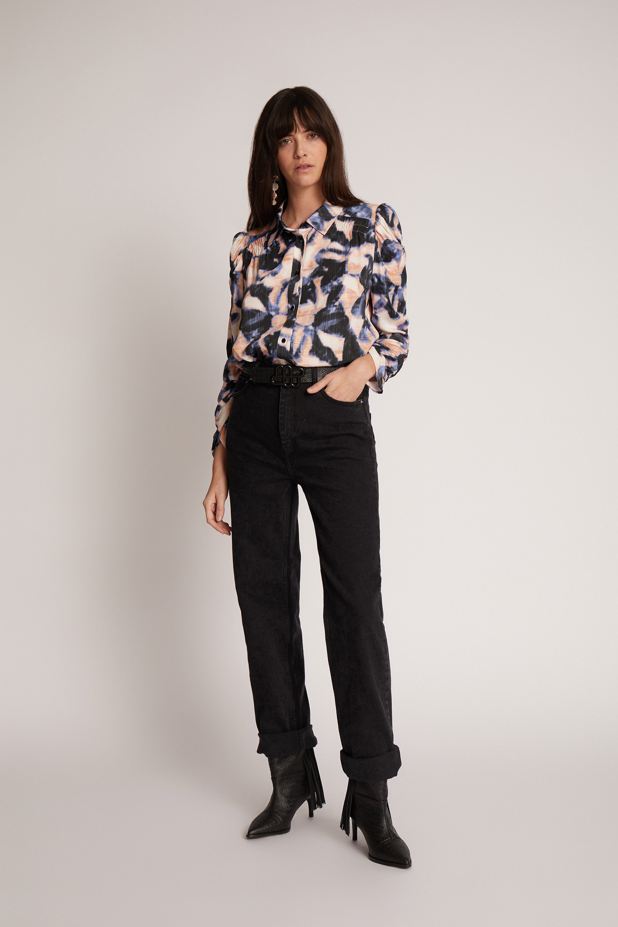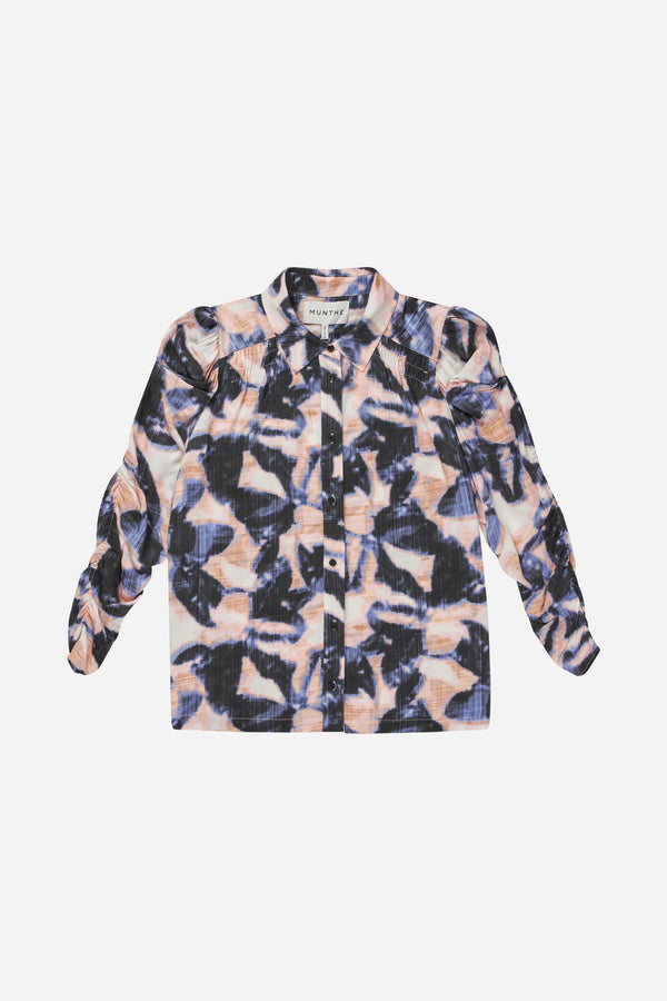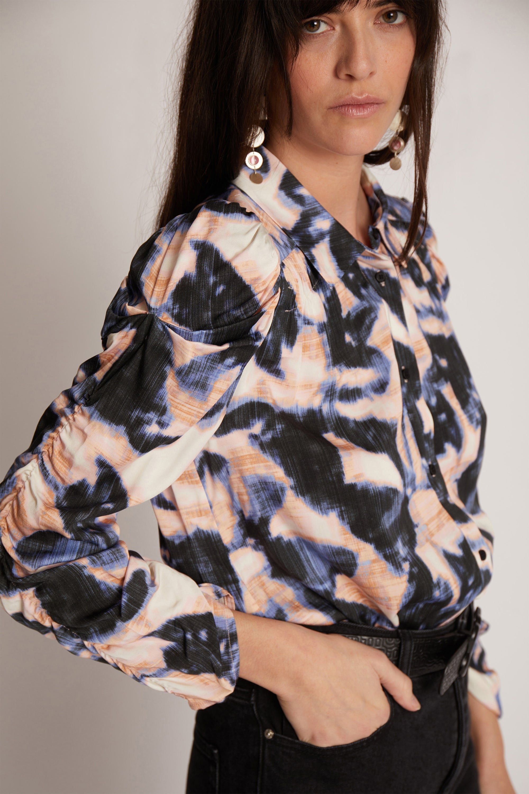 Bluse med et smukt all-over print og elegante rynke og smock detaljer på skuldre og ærmer. Blusen har en elegant knaplukning og lange ærmer med et lille puf ved skuldrene. Blusen er designet til en normal pasform.