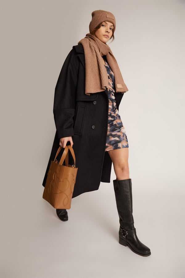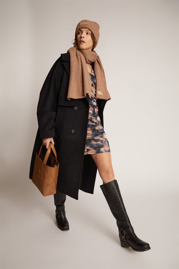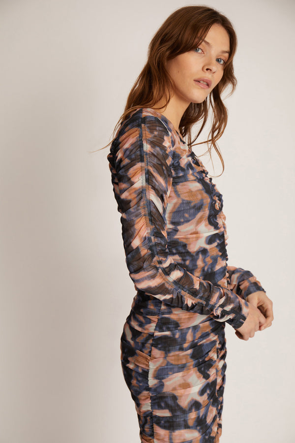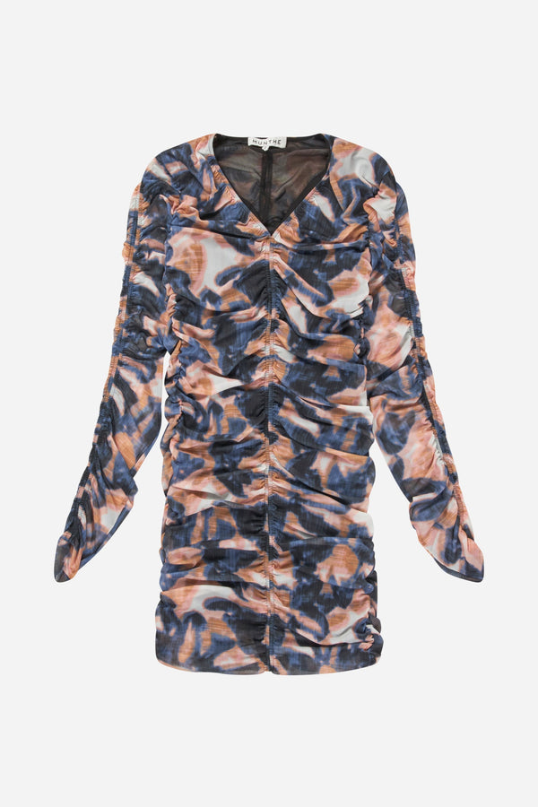 Kjole designet i et blødt mesh-stof, med et all-over print og elegante rynkedetaljer. Kjolen har en stram pasform, lange ærmer og v-udskæring.