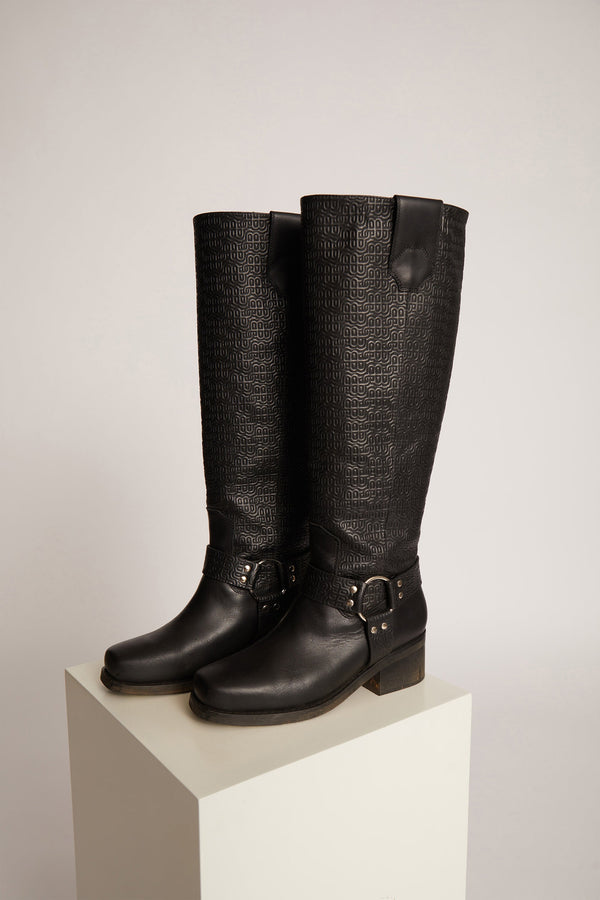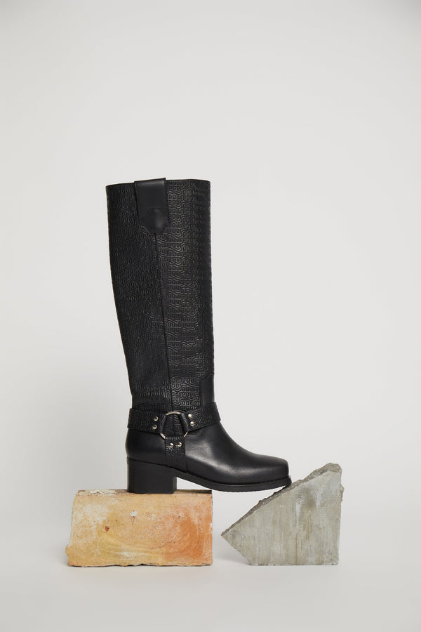 Chunky MUNTHE emblem støvler, med en elegant ankelrem. Disse smukke langskaftede støvler har en lav hæl og en let firkantet næse og er lavet af 100% læder.