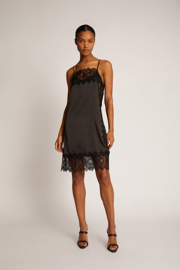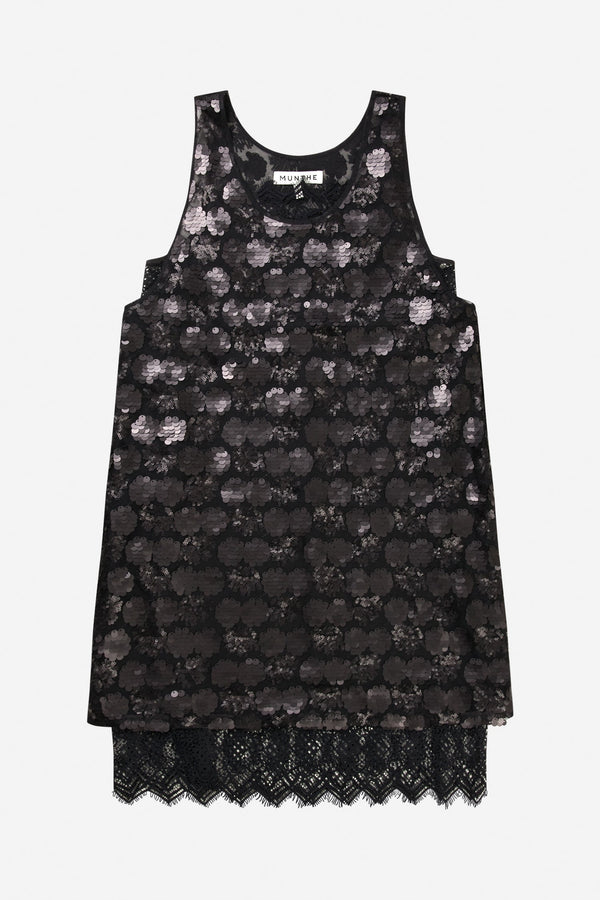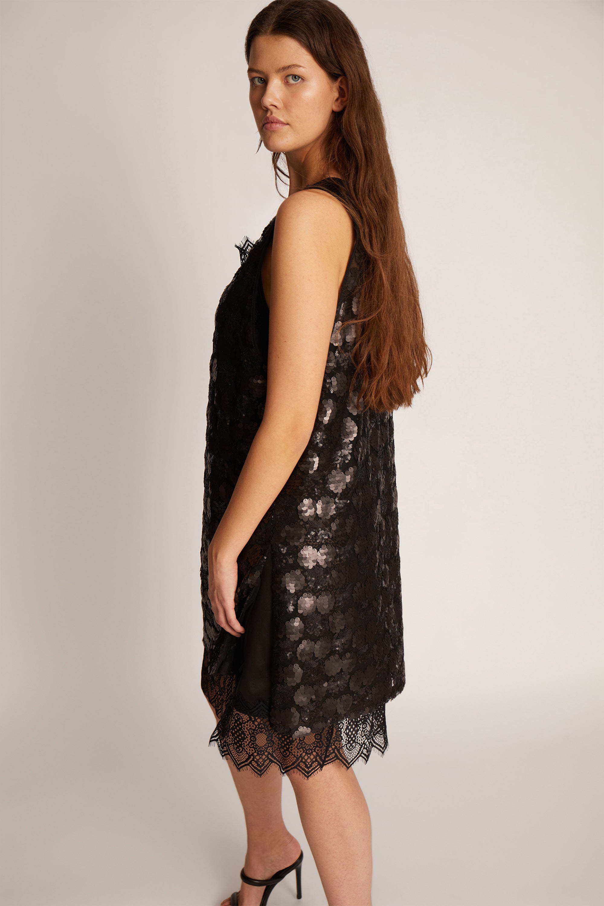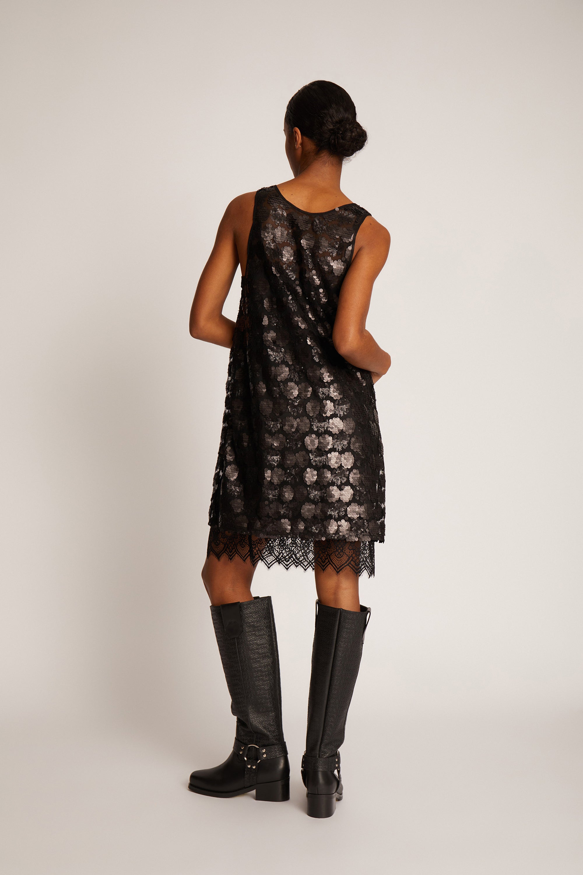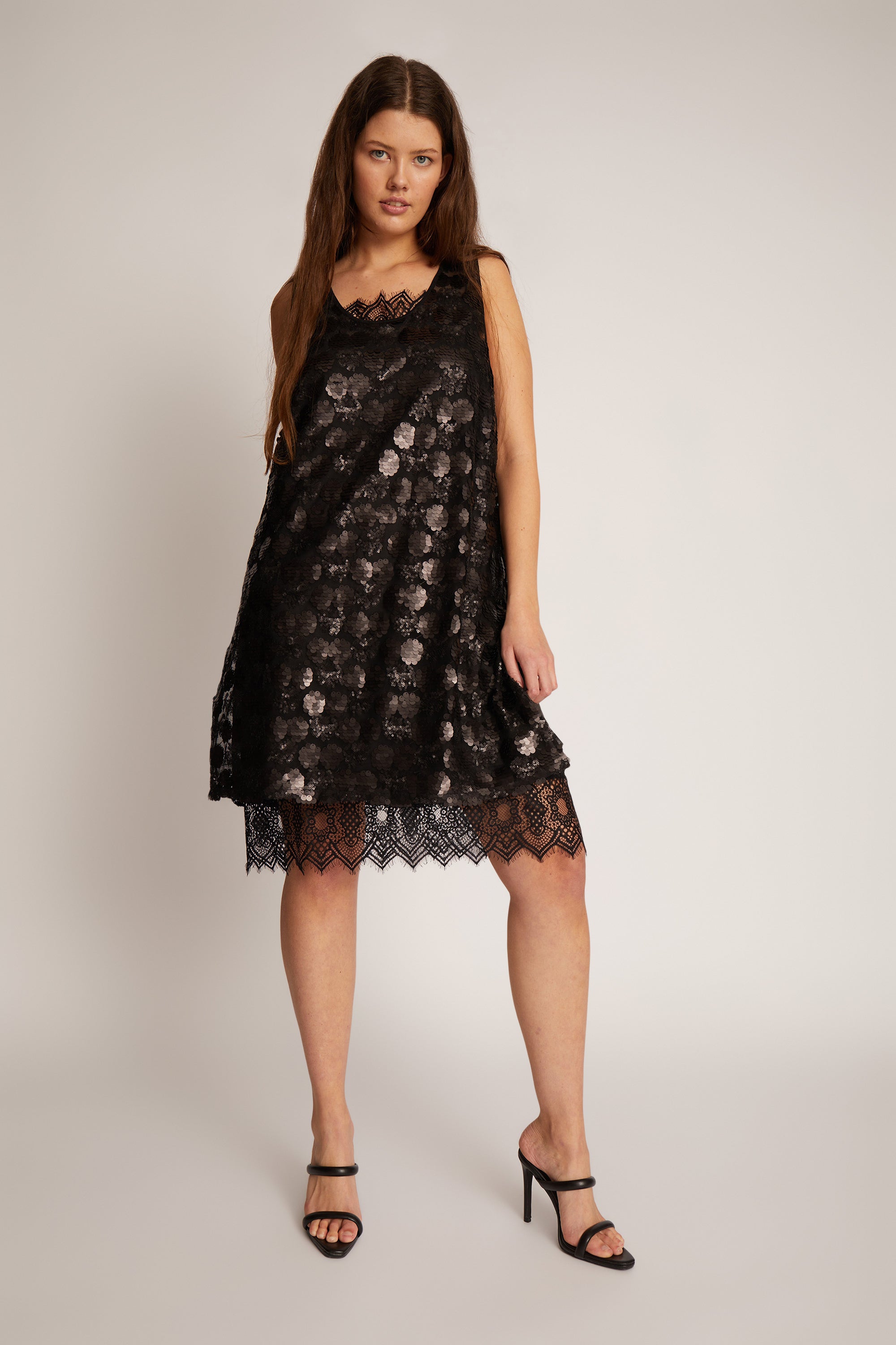 Kjole med et fint paillet mønster og en feminin slids i siden, som elegant afslører den smukke blonde underkjole, der stikker ud nederst. Blonde underkjolen kan bæres separat.