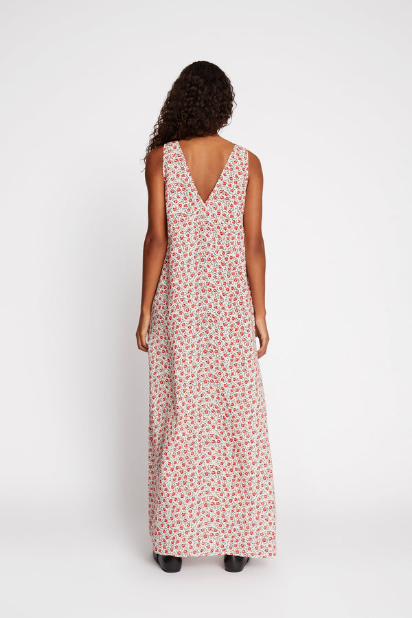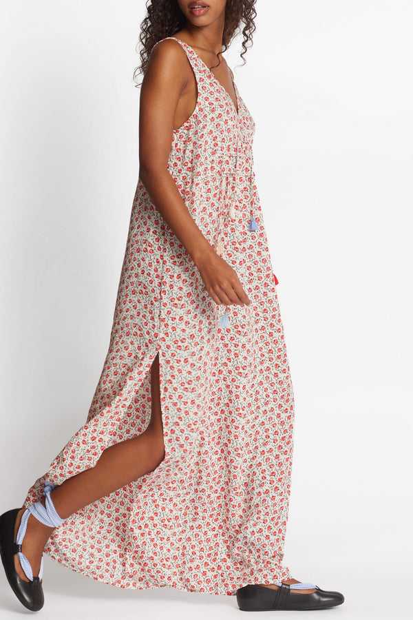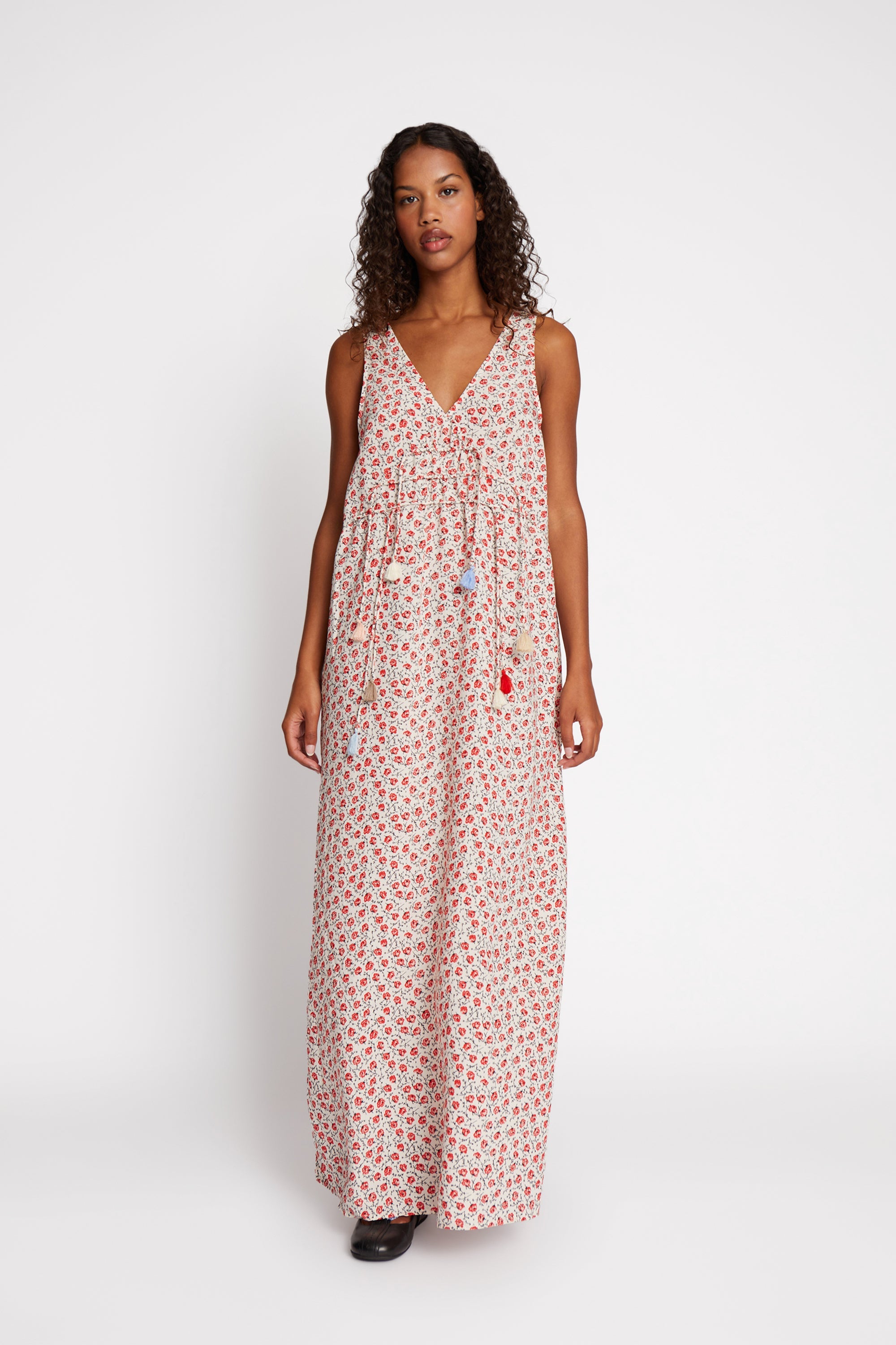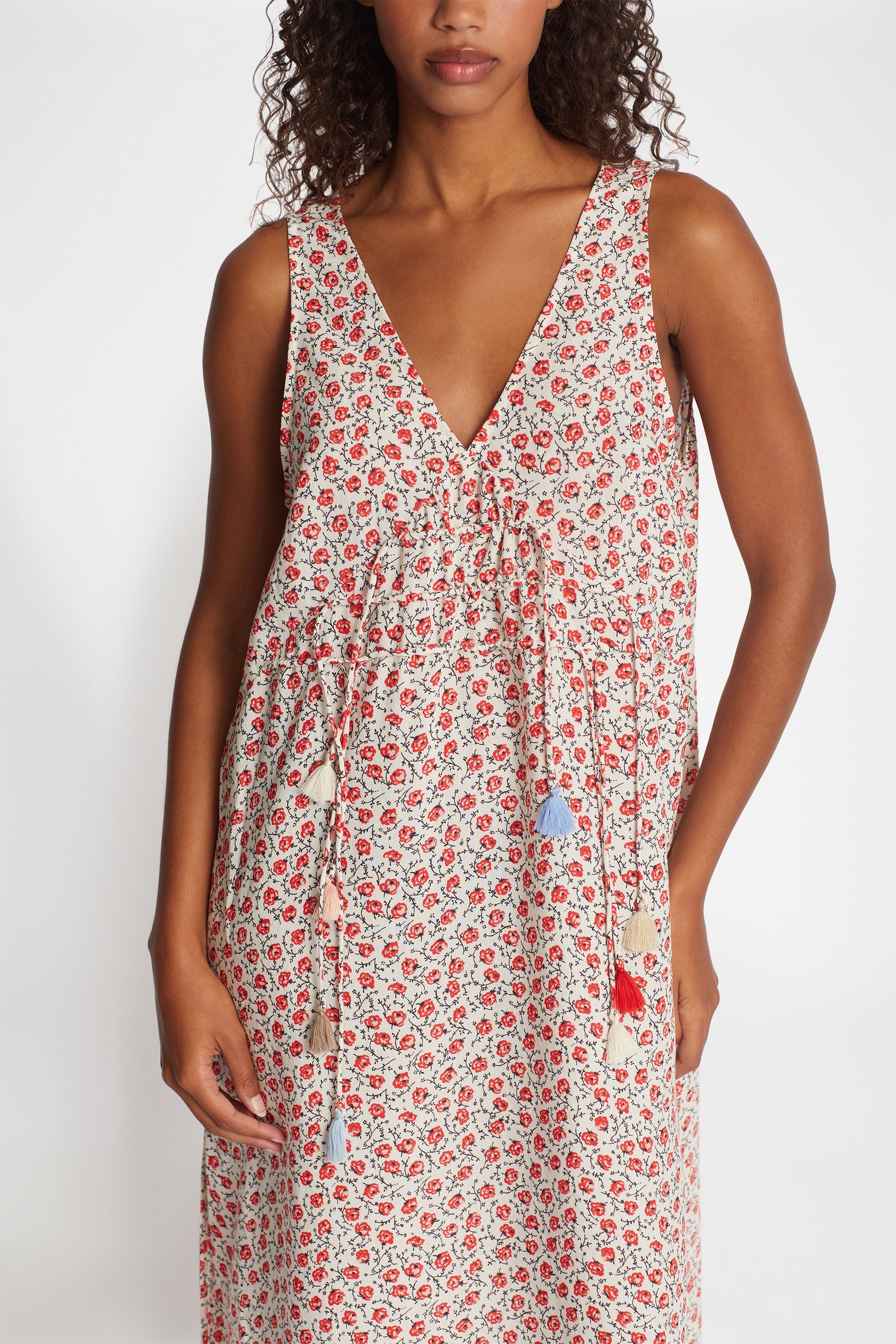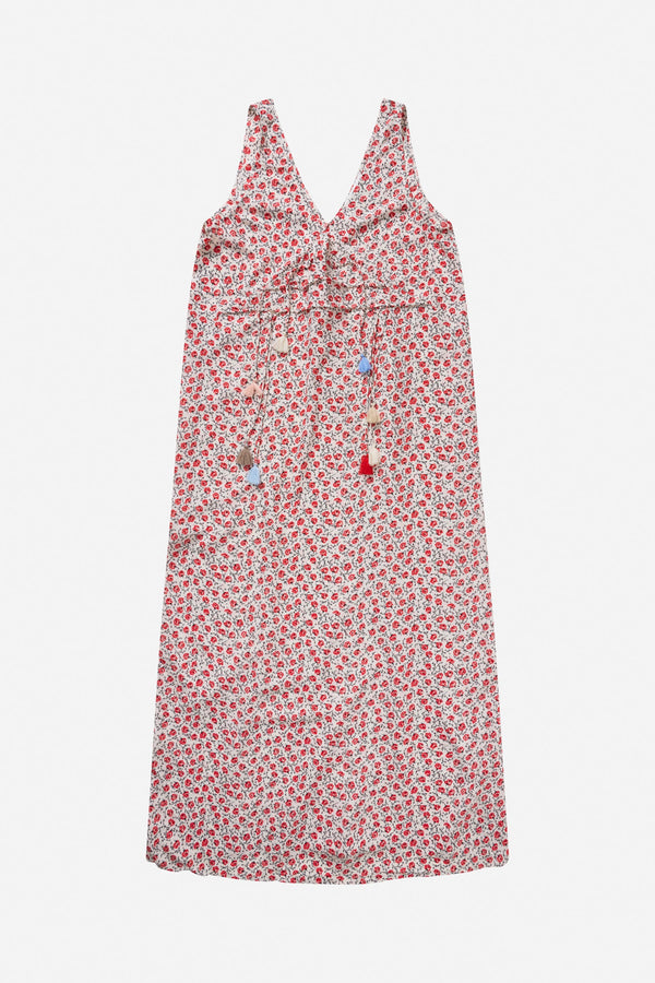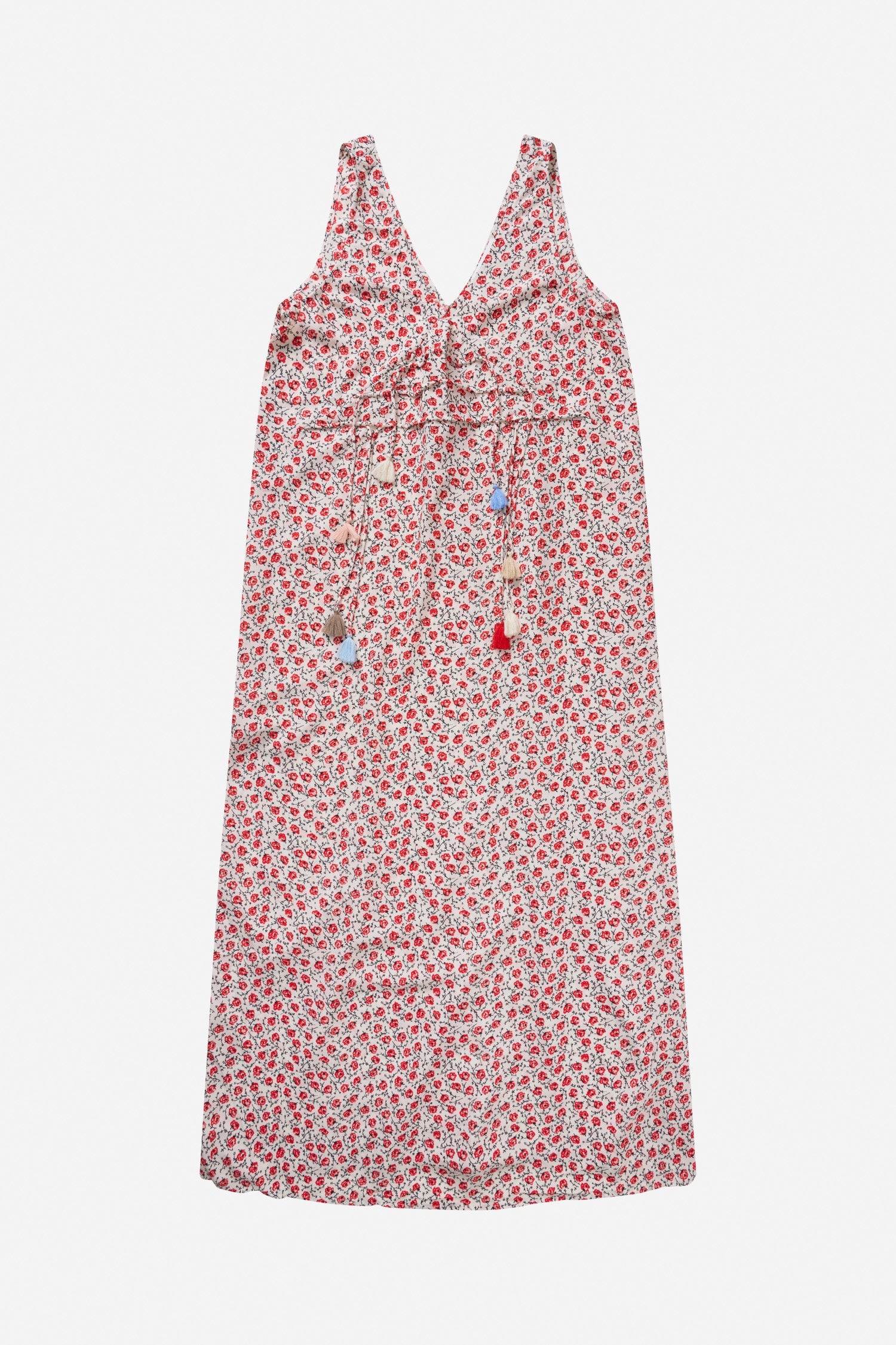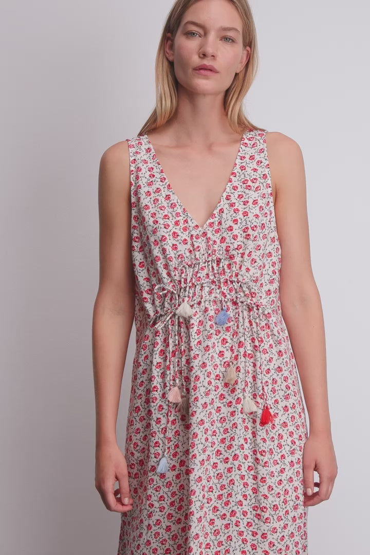 Elegant kjole med et fint blomster print, og smukke bindebånds detaljer ved brystet. Hvert bindebånd afsluttes elegant med små farvede kvaster.