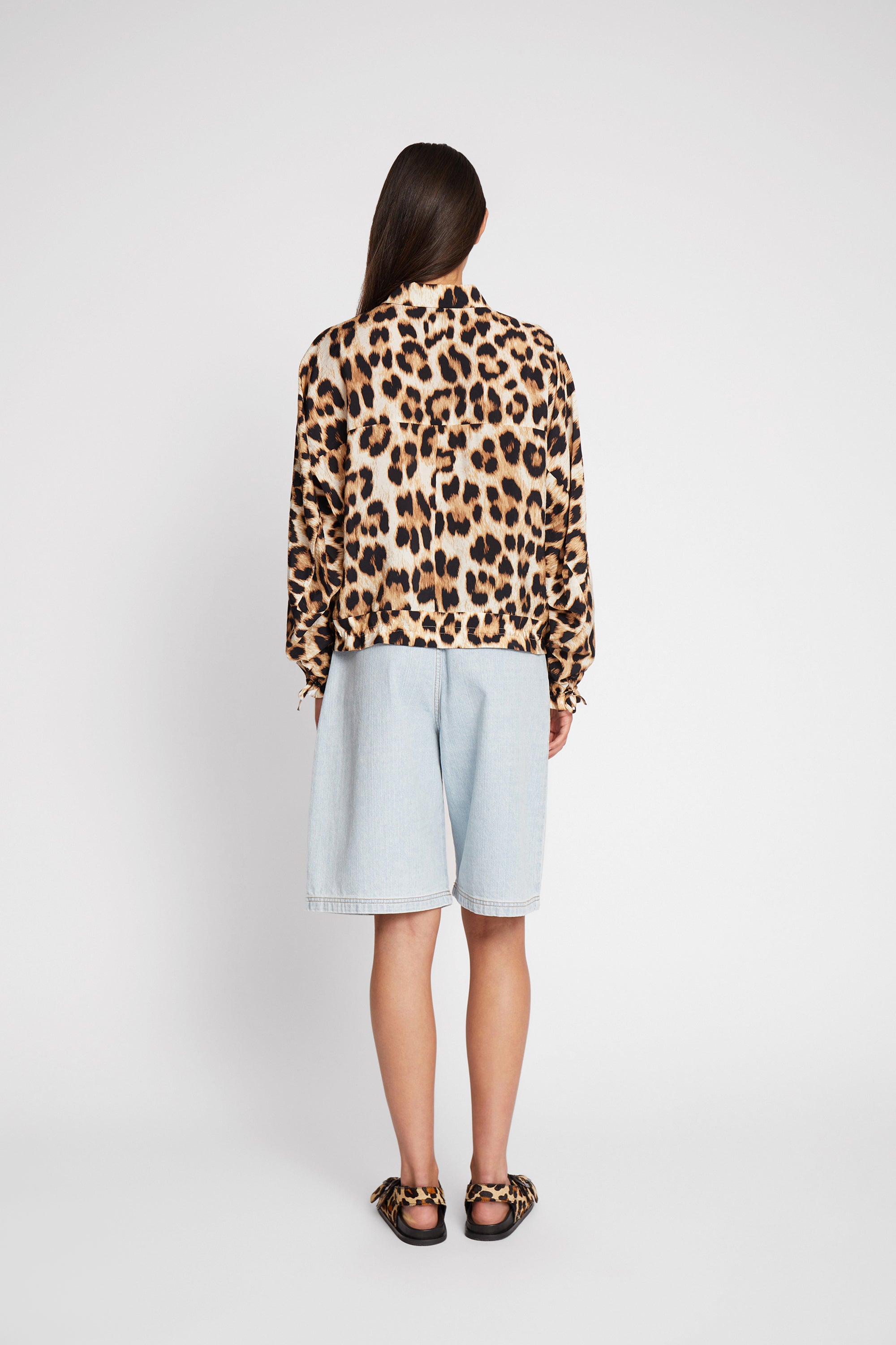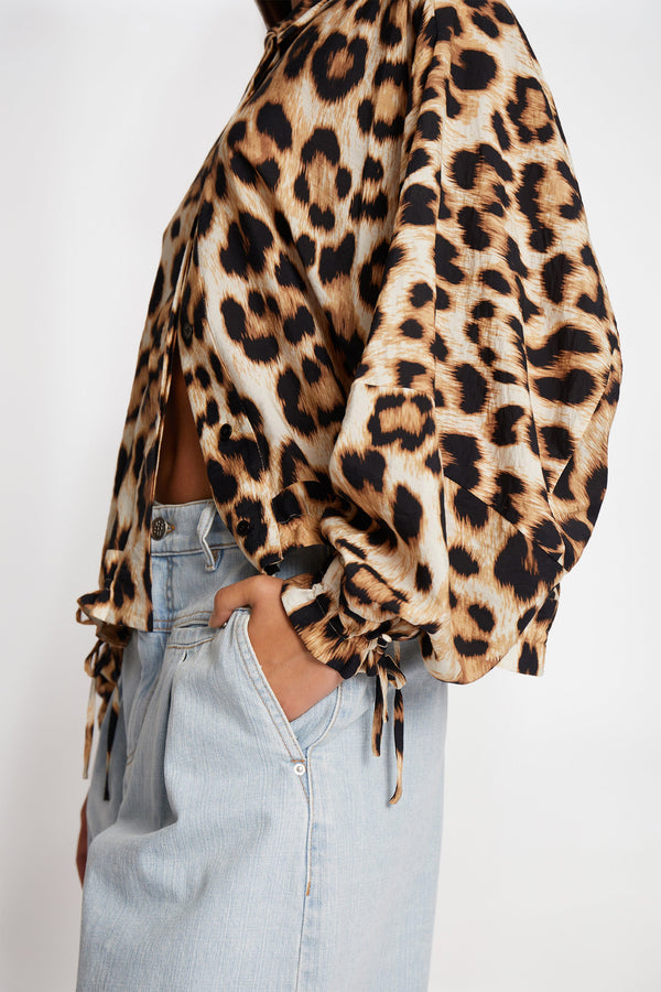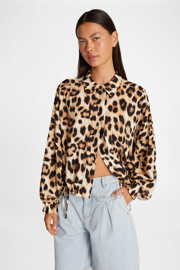Skjorte med et elegant leo print og smukke bindebånds detaljer nederst samt på ærmerne. Skjorten er designet med løse ærmer, og kan styles åben såvel som lukket.