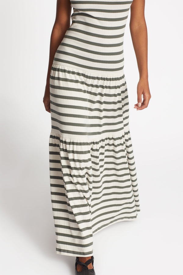 Blød lang rib kjole med fine klassiske striber og elegante overskæringer i skørtet på kjolen. Denne kjole er lavet af 100% økologisk bomuld.