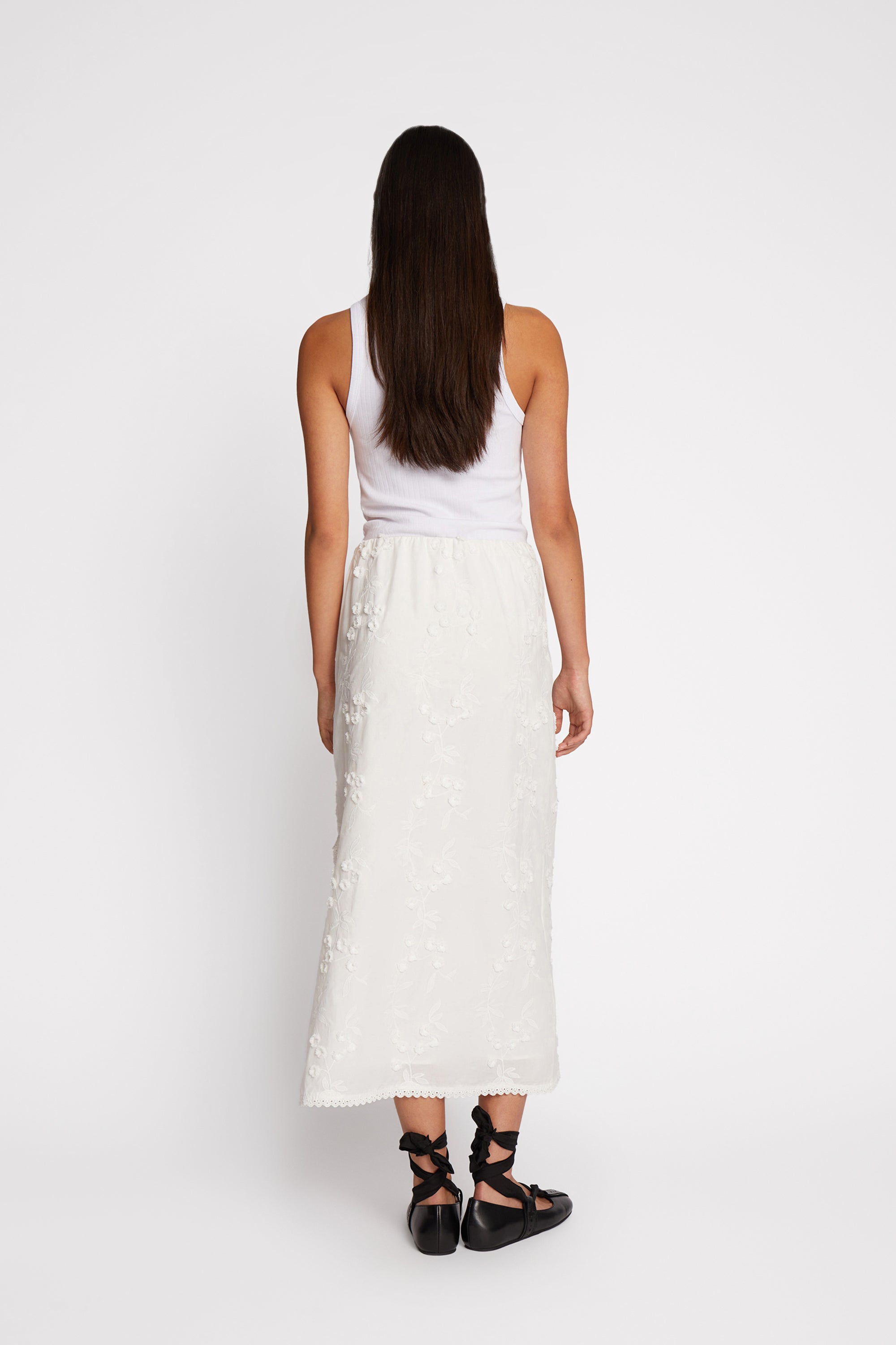 Nederdel med et smukt all-over blomster broderi kombineret med fine blomster applikationer. Nederdelen er designet med en elastik i taljen, og en elegant slids i siden.