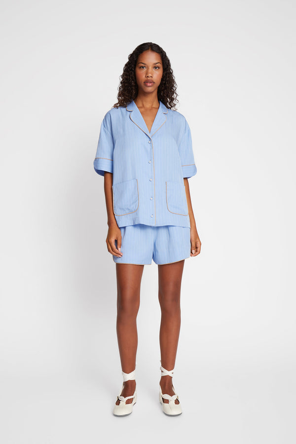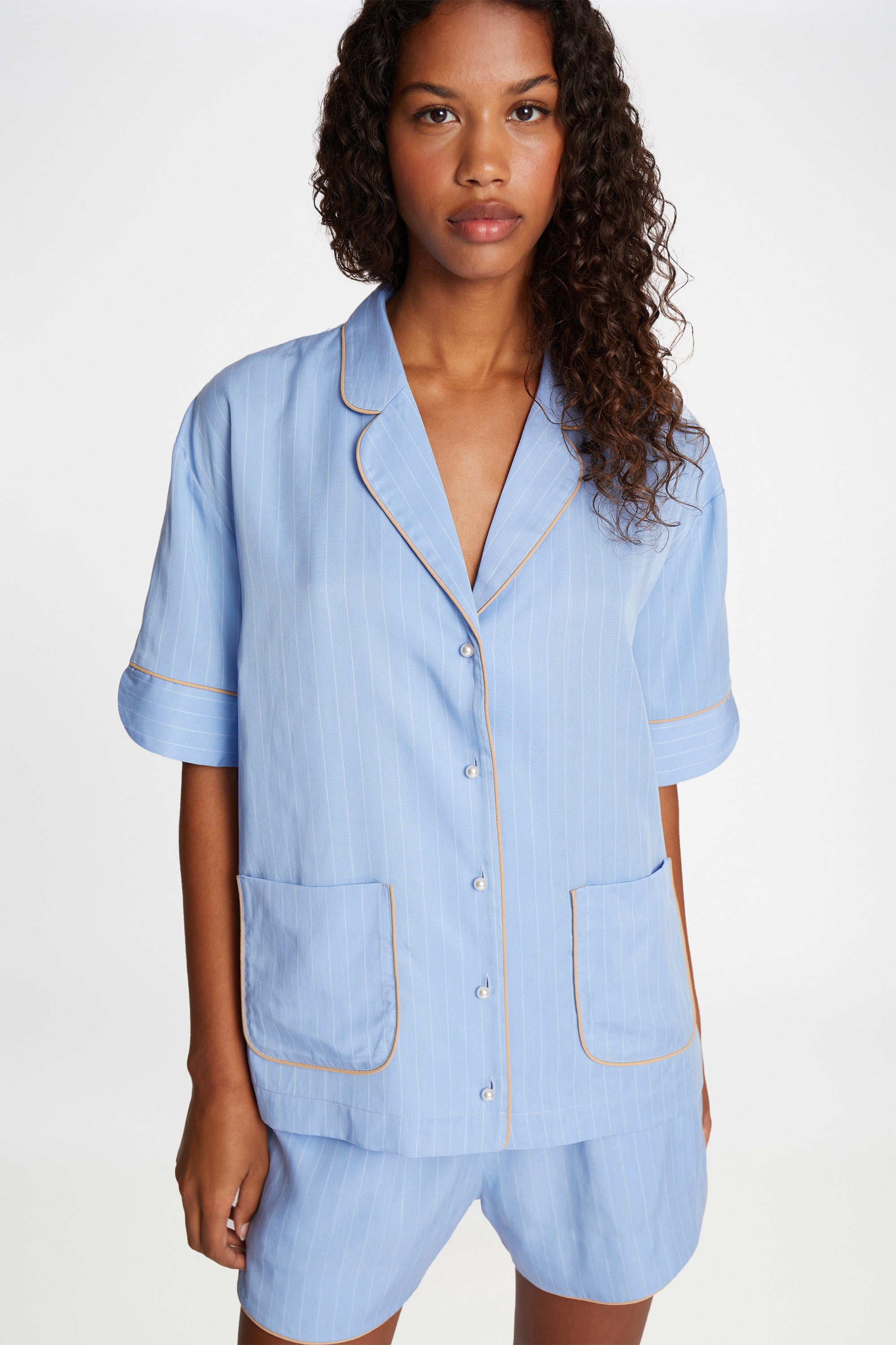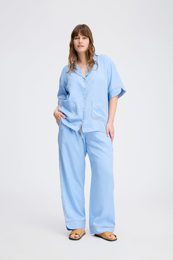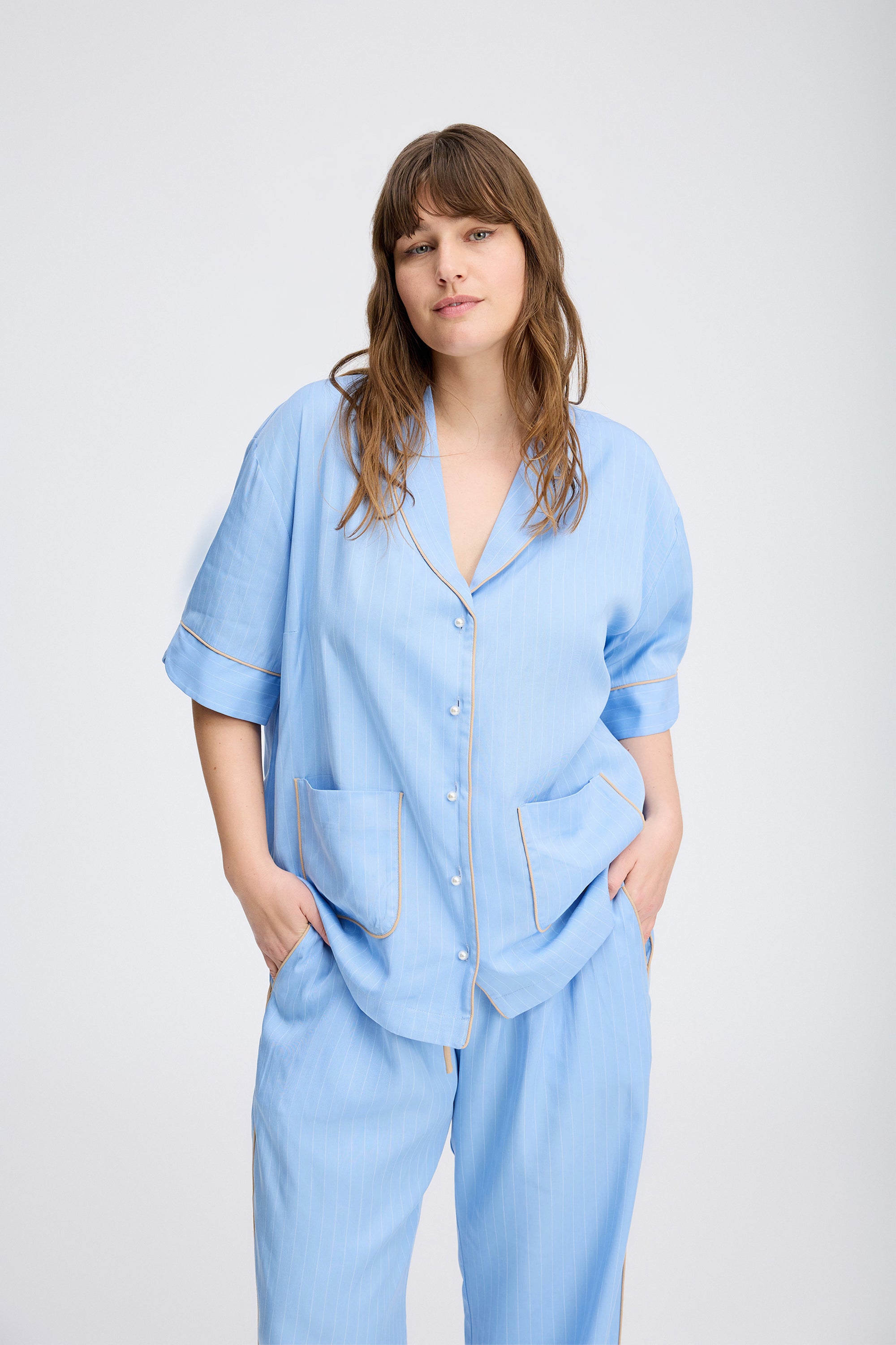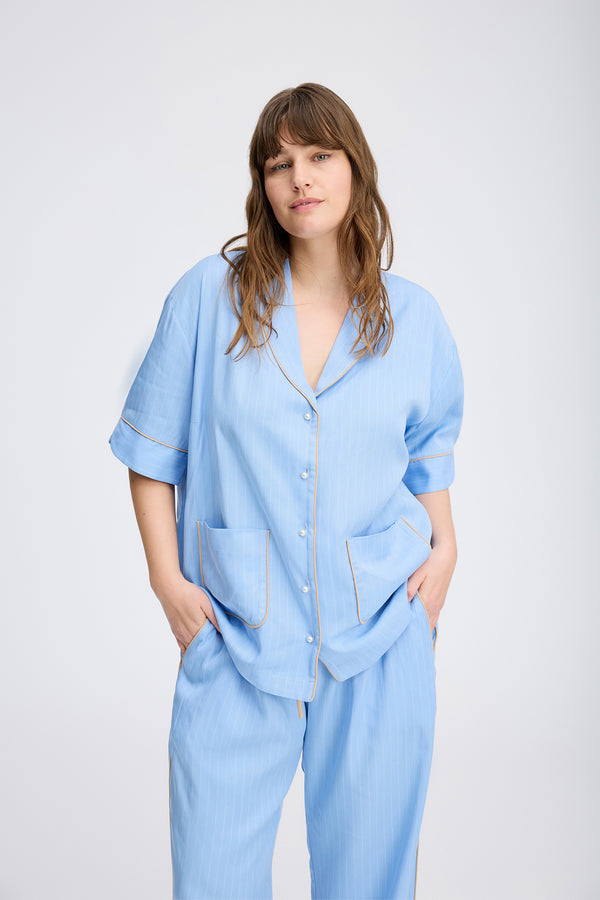 Nålestribet skjorte bluse med smukke beige piping bånd, og elegante perle knapper. Skjorte blusen er designet med 2 fine lommer og elegante detaljer på ærmet.