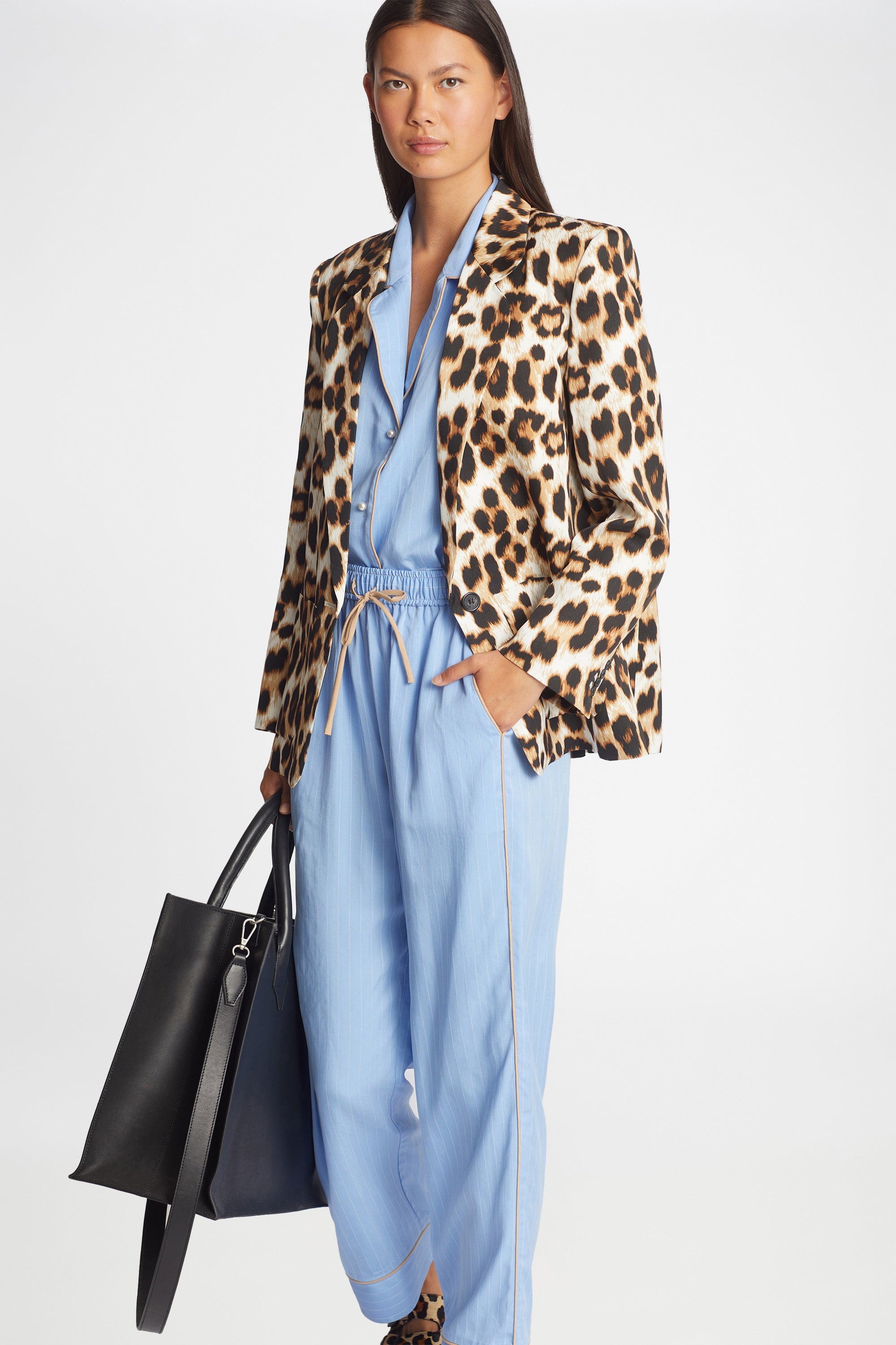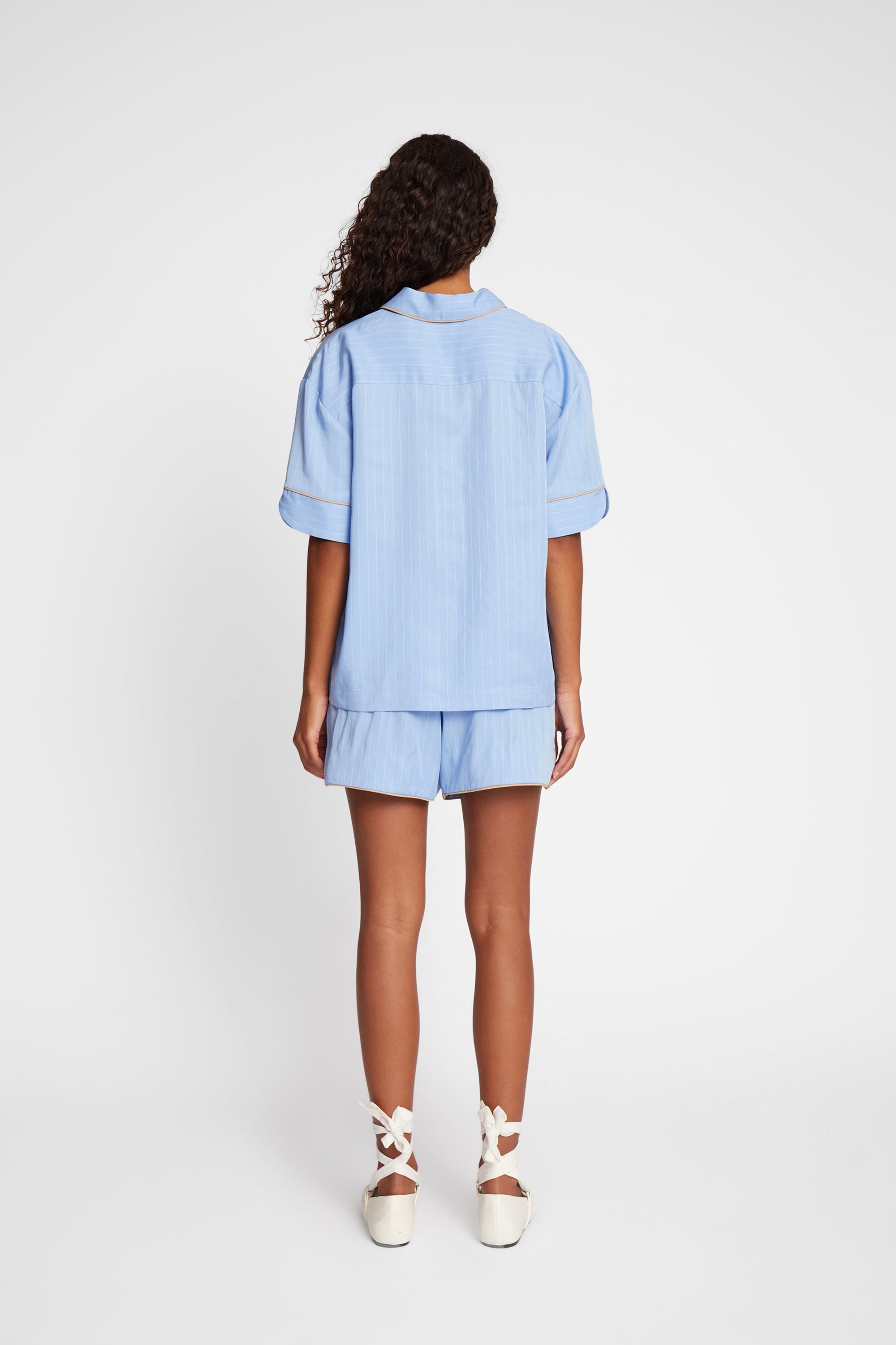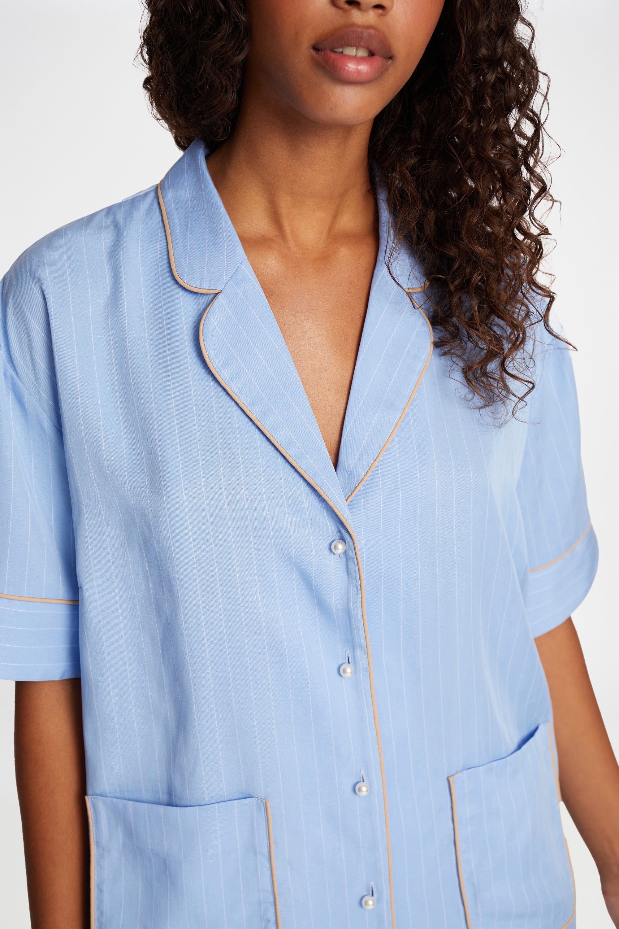 Nålestribet skjorte bluse med smukke beige piping bånd, og elegante perle knapper. Skjorte blusen er designet med 2 fine lommer og elegante detaljer på ærmet.