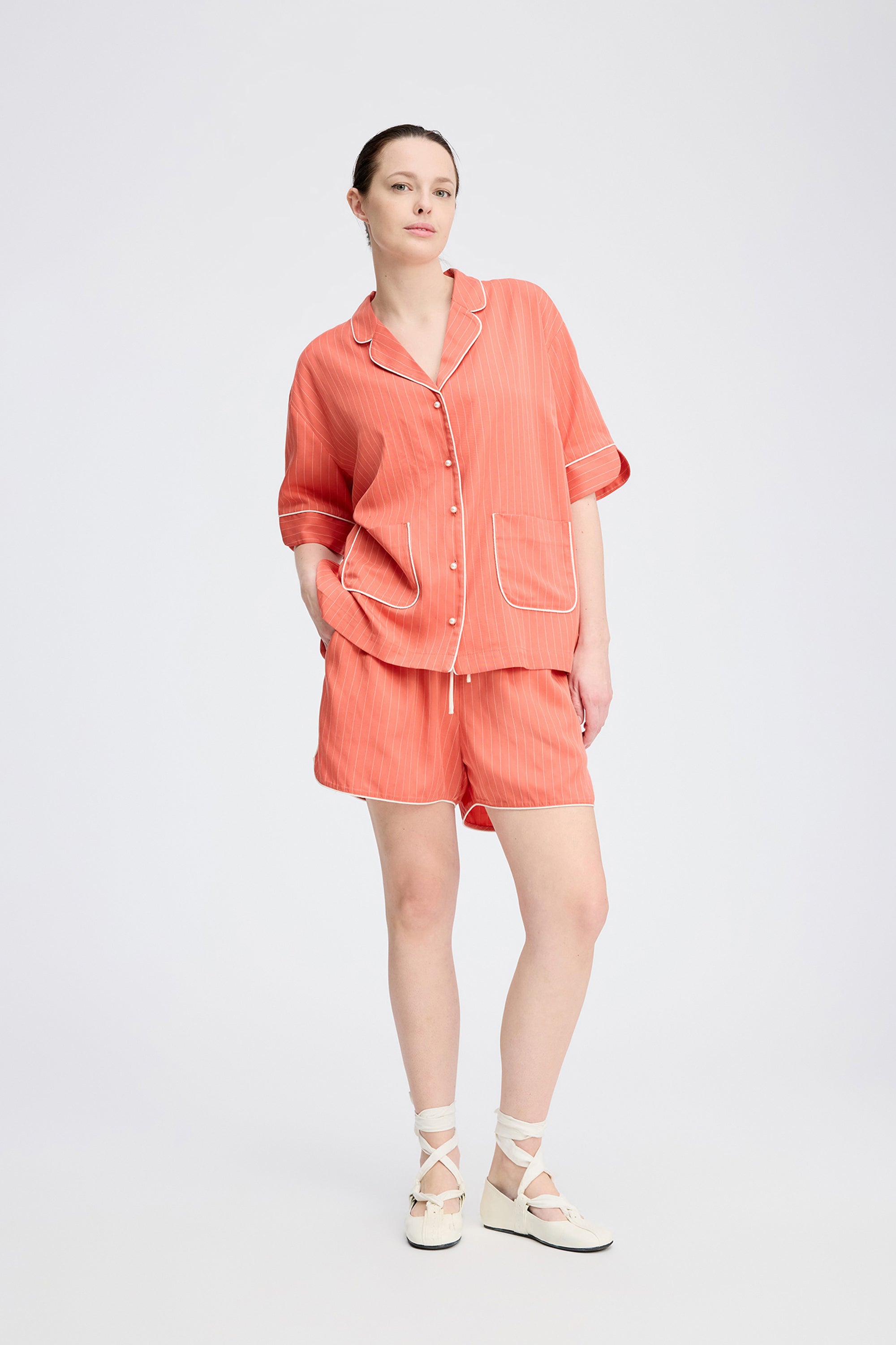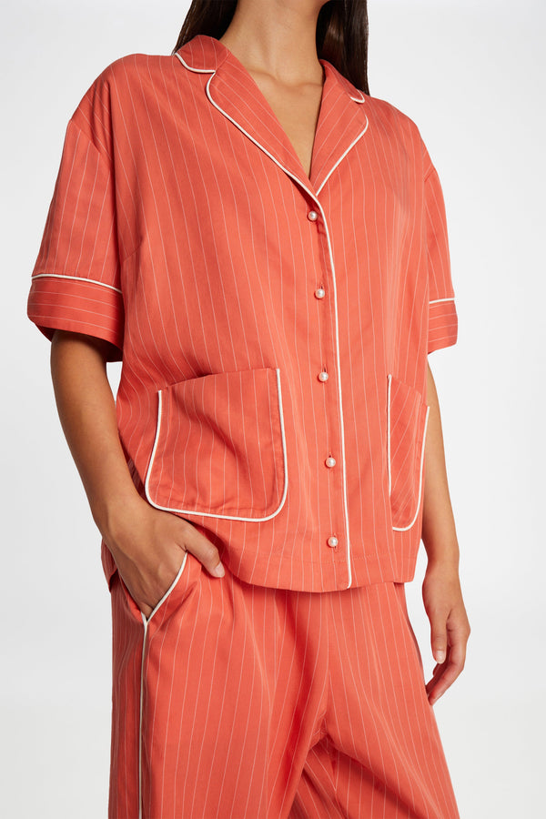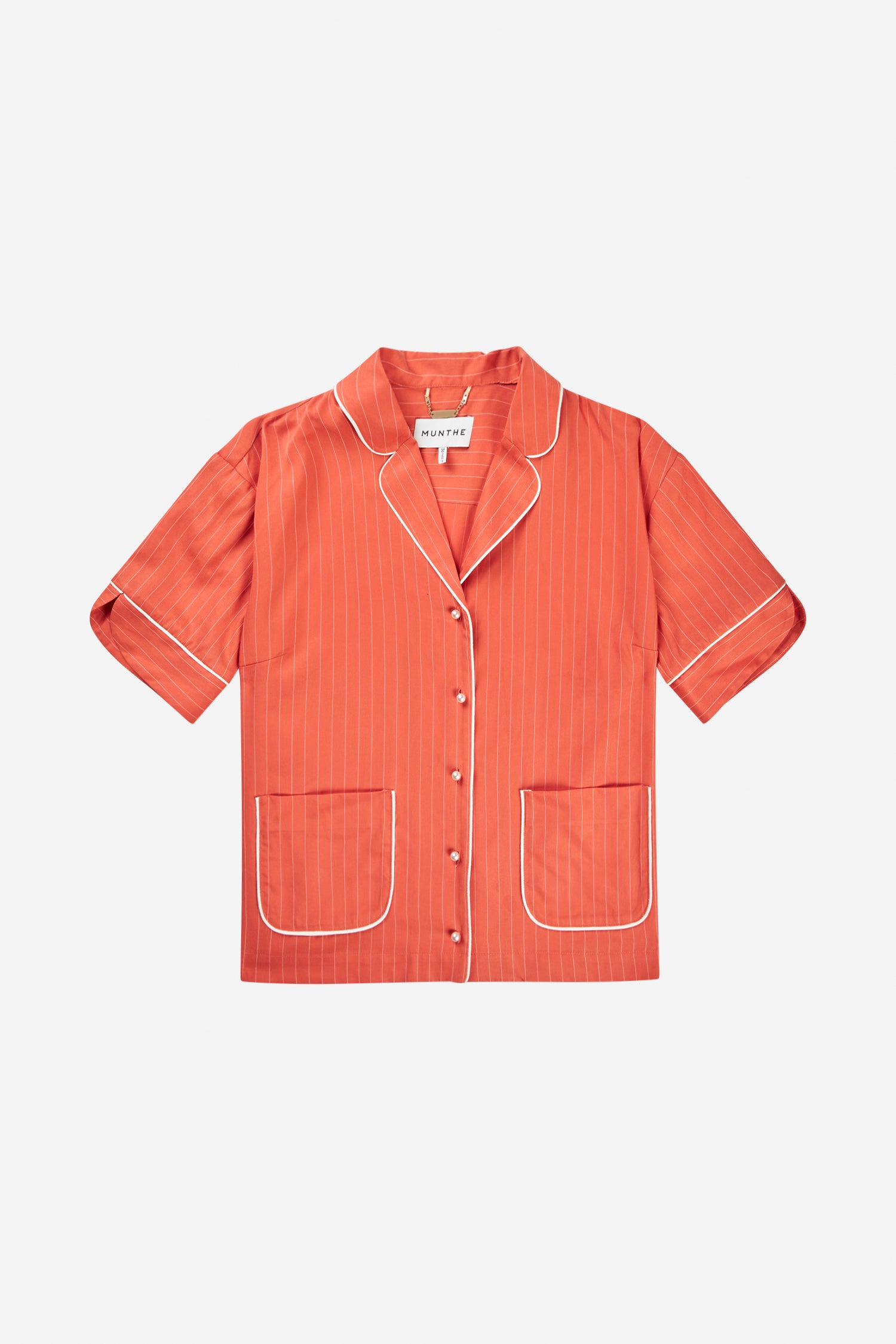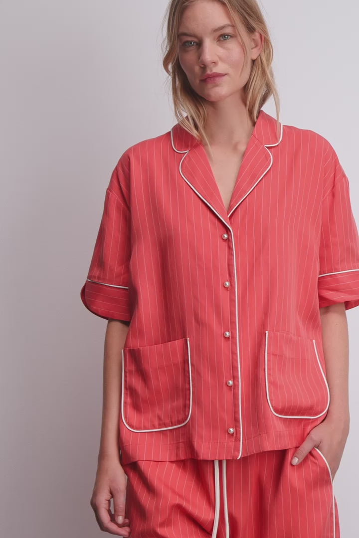 Nålestribet skjorte bluse med smukke hvide piping bånd, og elegante perle knapper. Skjorte blusen er designet med 2 fine lommer og elegante detaljer på ærmet