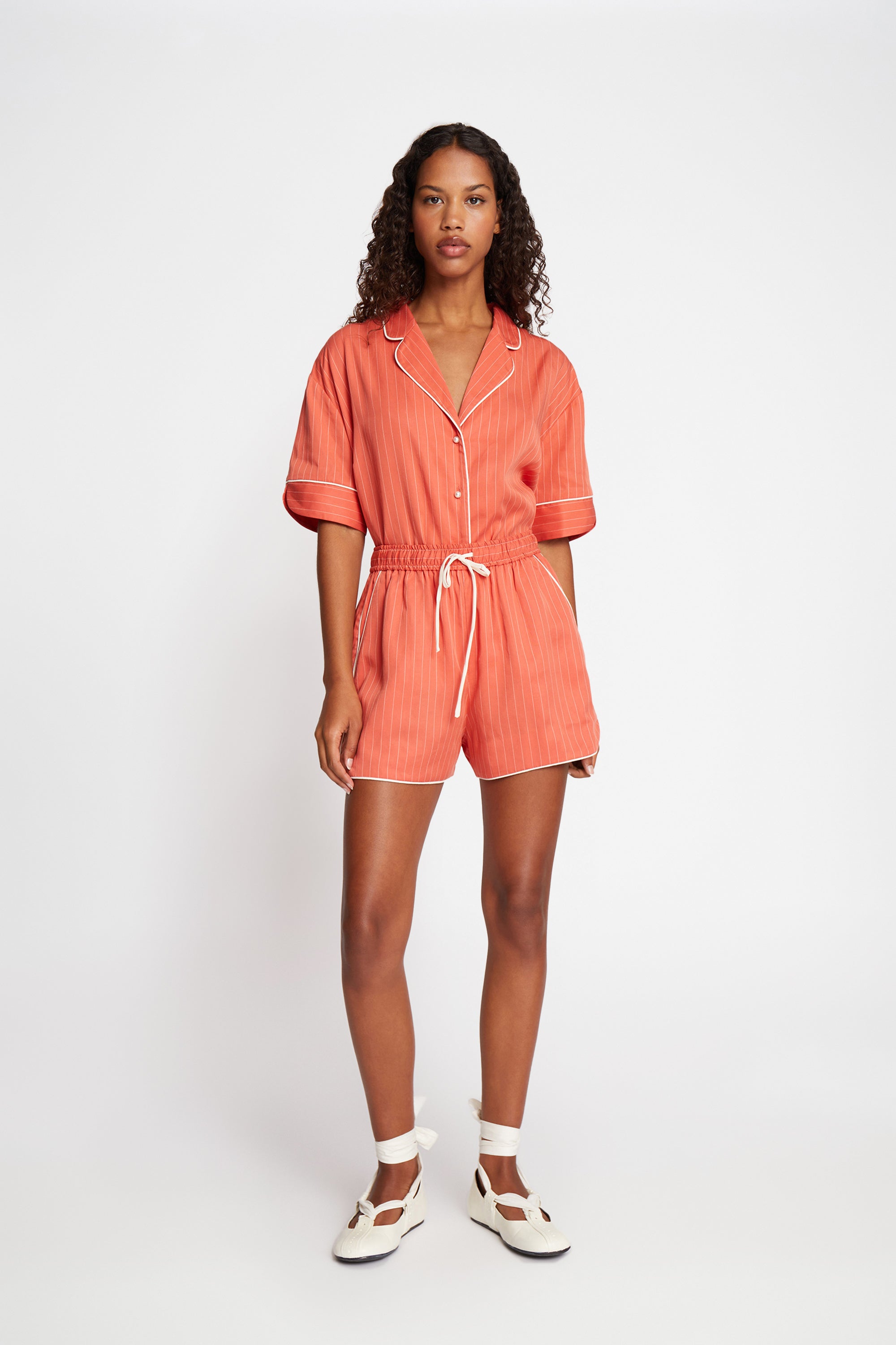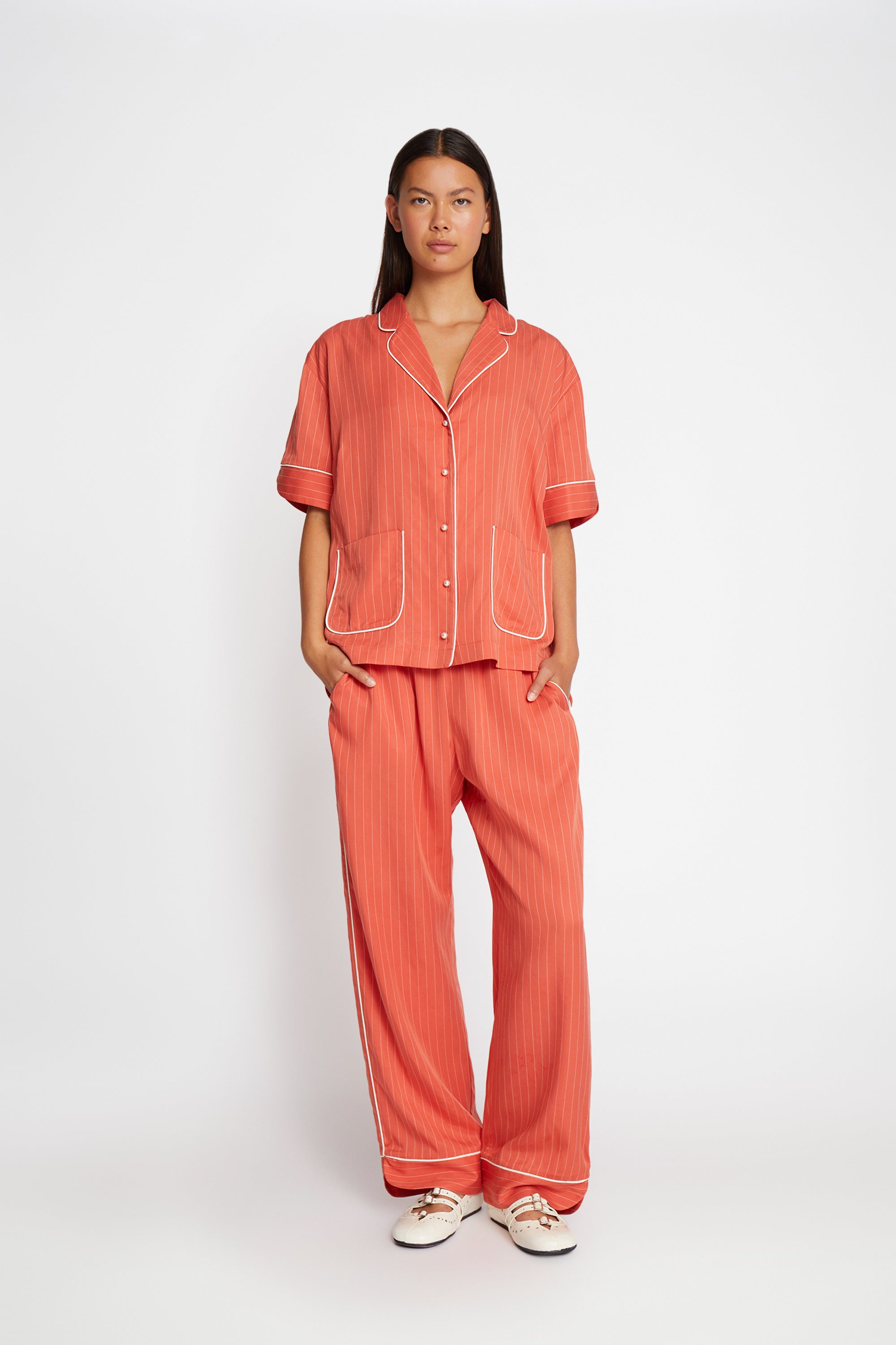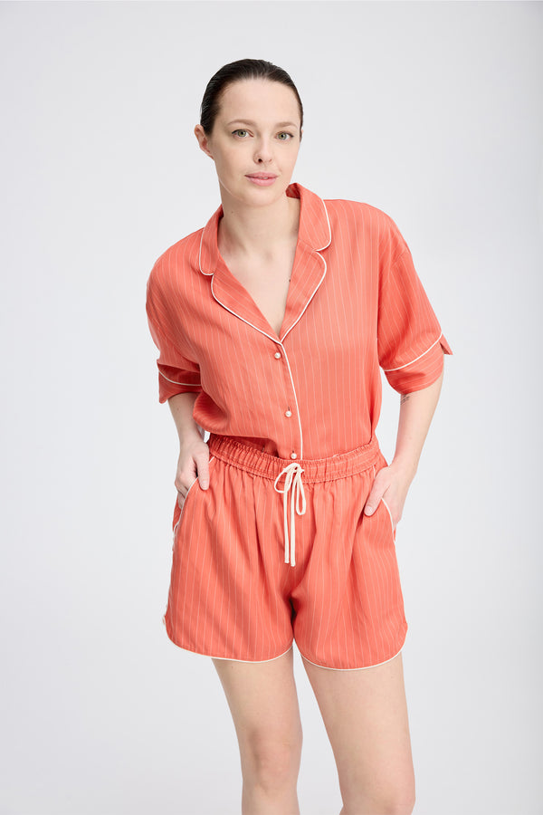 Nålestribet skjorte bluse med smukke hvide piping bånd, og elegante perle knapper. Skjorte blusen er designet med 2 fine lommer og elegante detaljer på ærmet