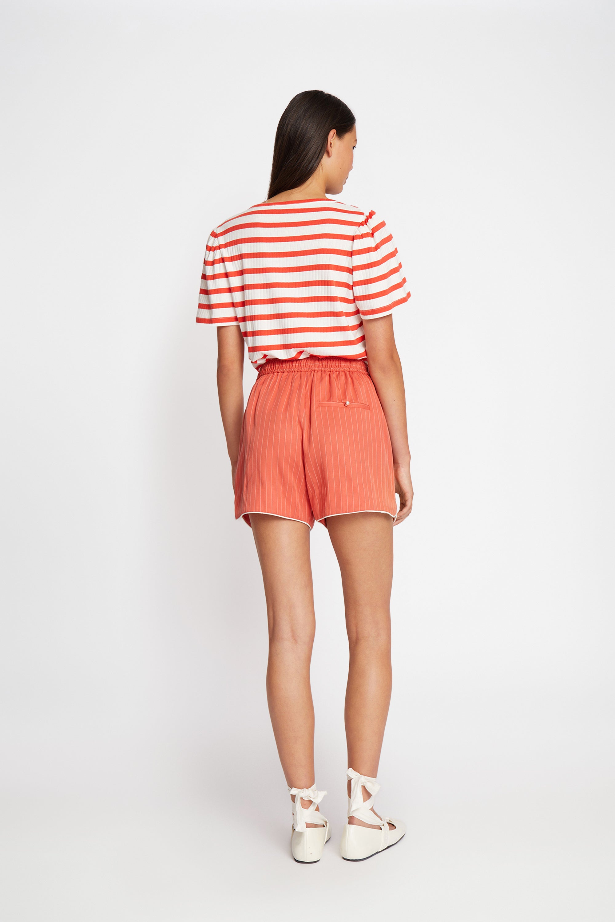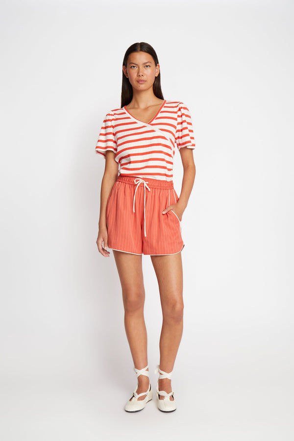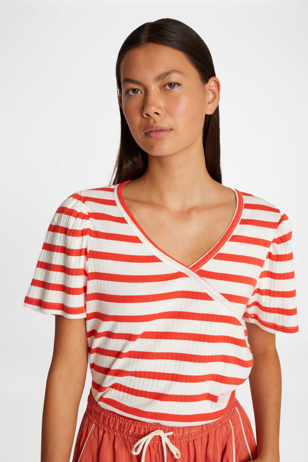Stribet T-shirt i 100% økologisk bomuld med en elegant slå om effekt. Denne T-shirt har en normal pasform og korte ærmer med et let puf ved skulderen.