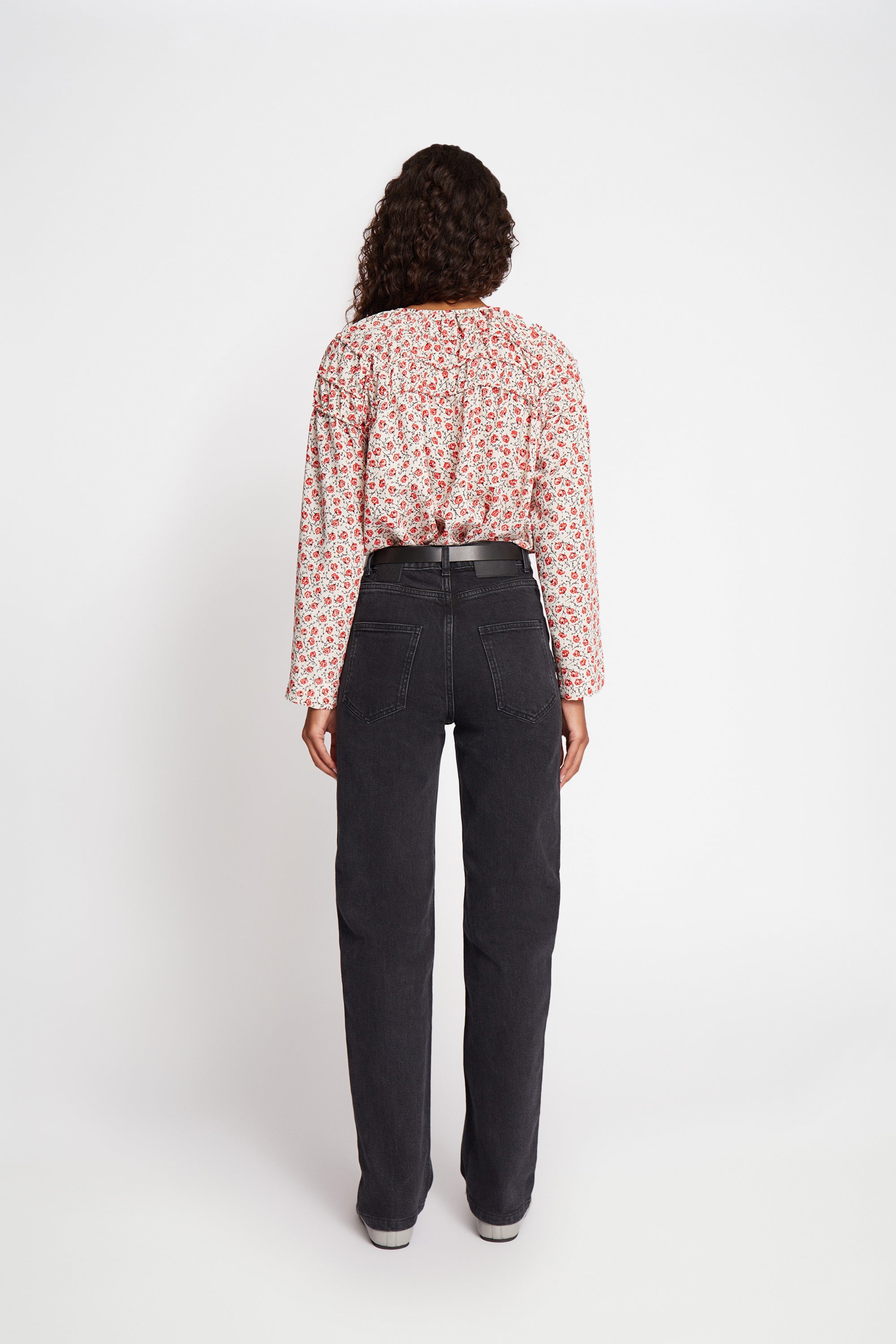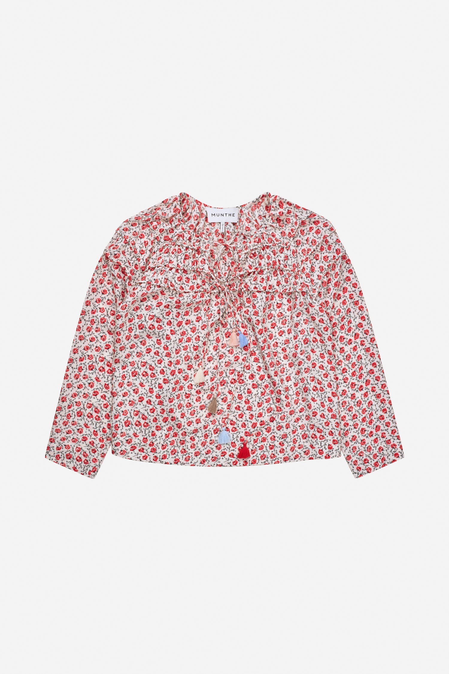 Bluse med et fint blomster print, og smukke bindebånds detaljer ved brystet. Hvert bindebånd afsluttes elegant med små farvede kvaster. Blusen er designet med lange ærmer og har et almindeligt fit.