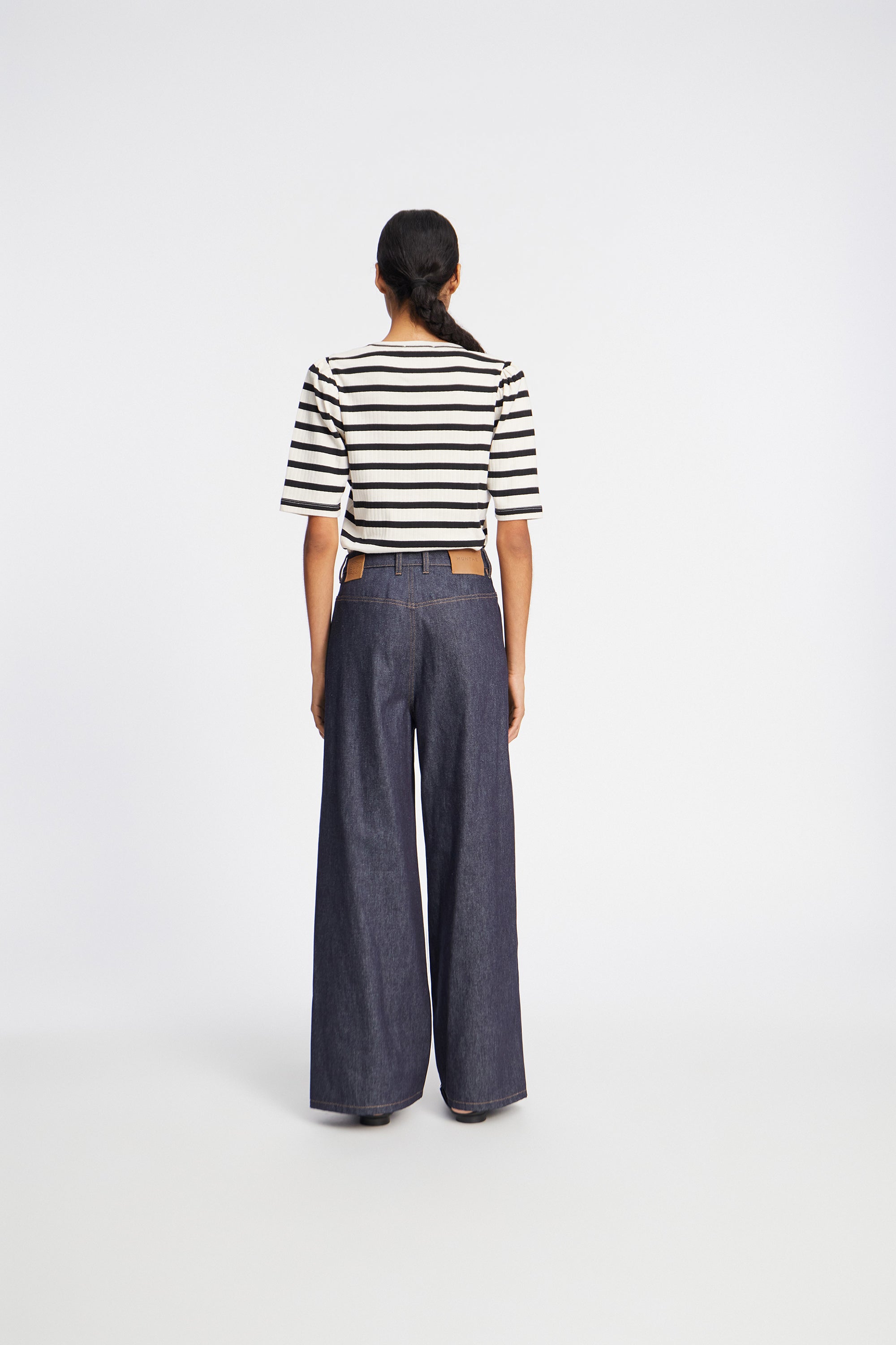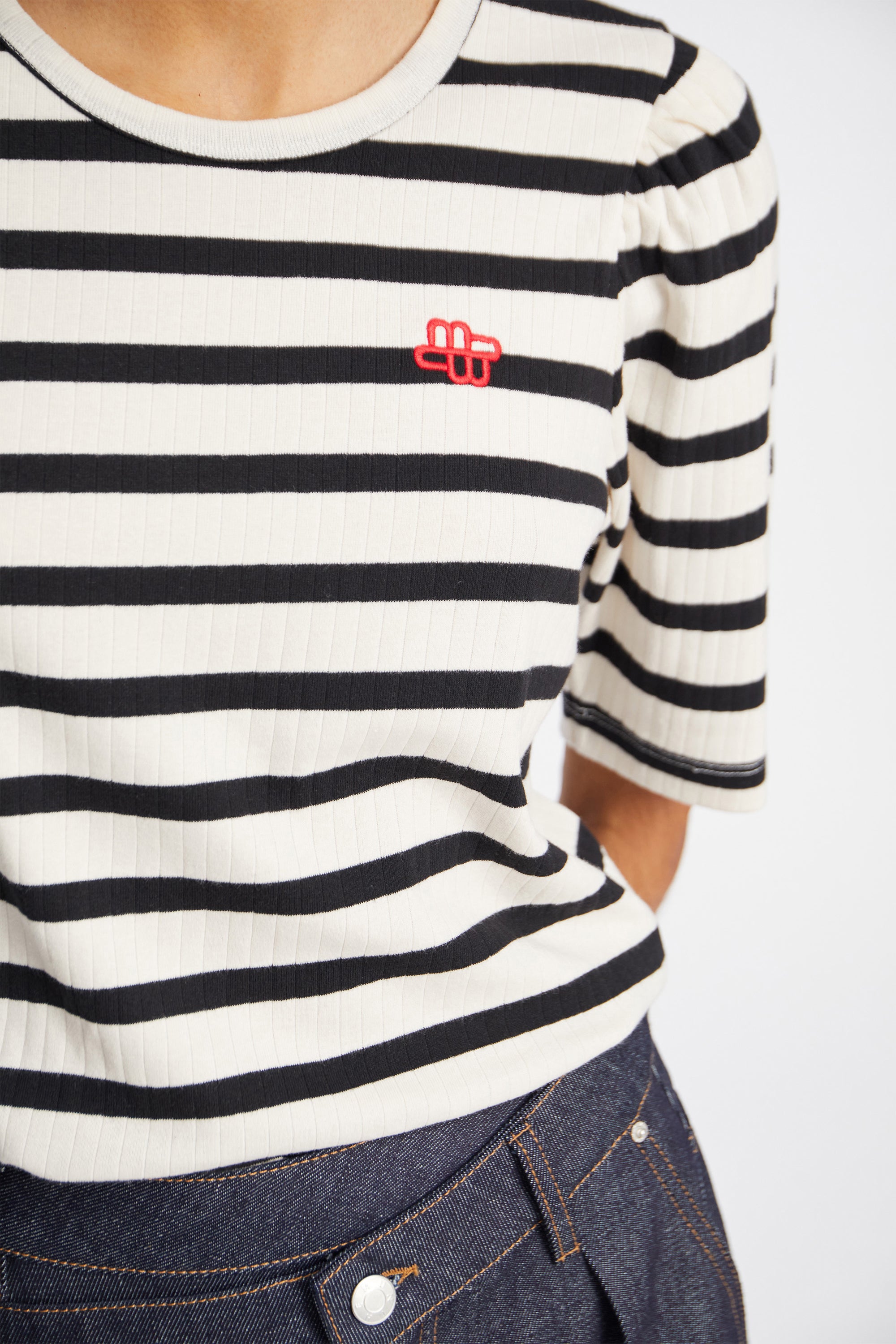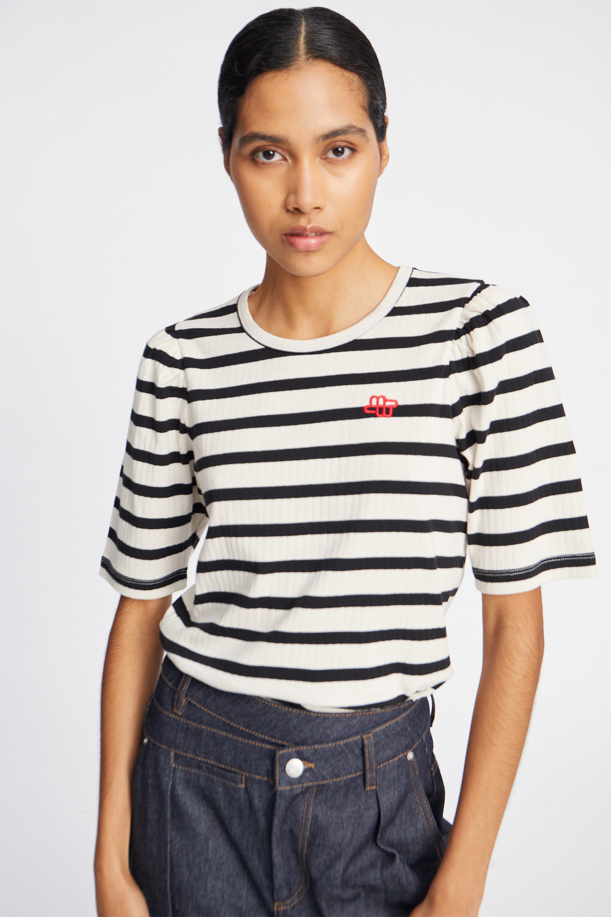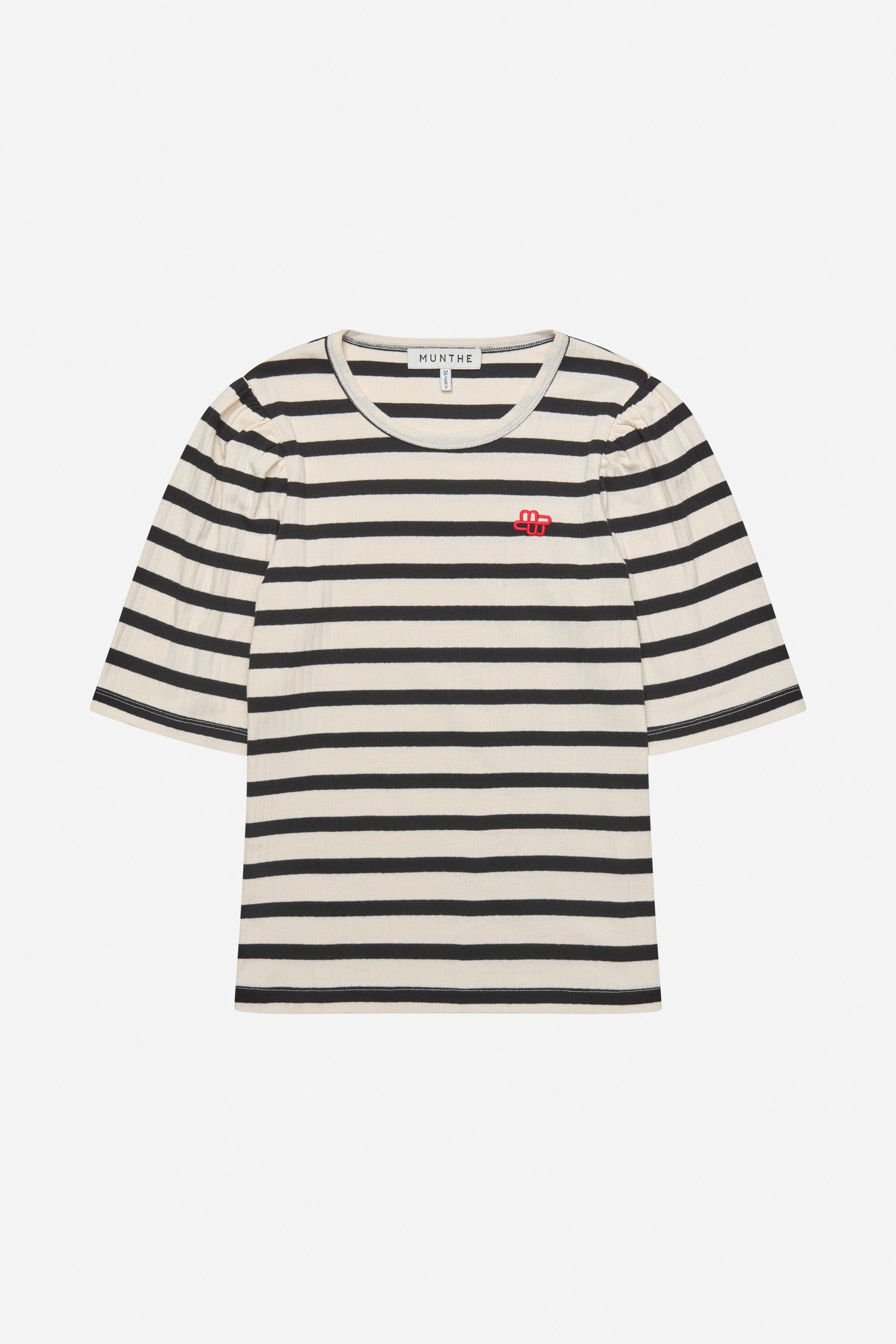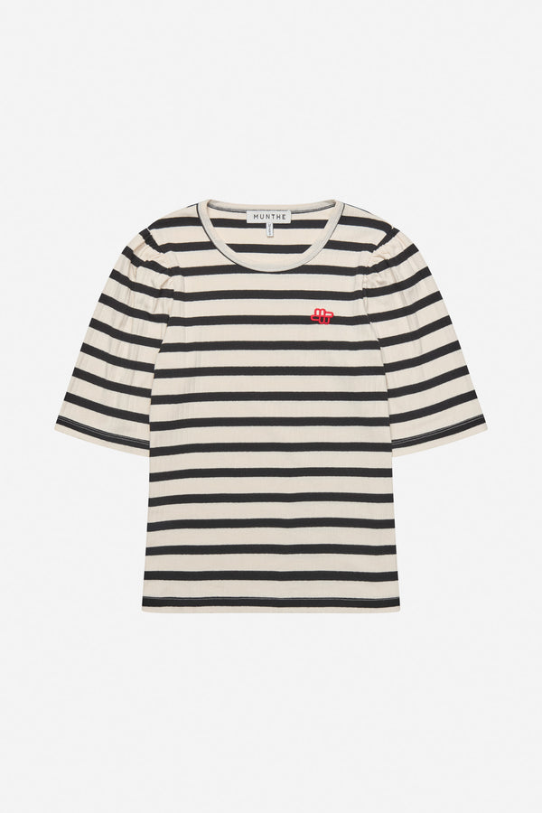 Stribet T-shirt med et lille elegant feminint puf ærme og et smukt broderet MUNTHE emblem. T-shirten er lavet i 100% økologisk bomuld og designet med rund hals og lav skuldersøm.
